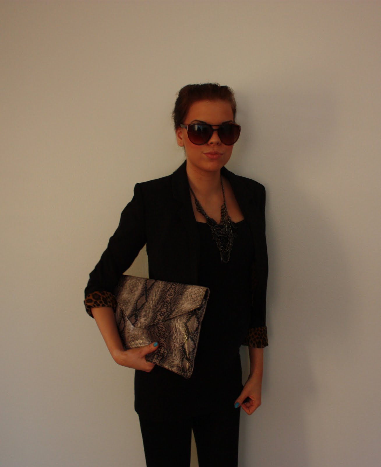 | Päivän asu: Bleiseri, toppi, legginsit: h&m, Aurinkolasit: Bershka, Kaulakoru: Lindex, Kengät: Bianco, Laukku: GT |