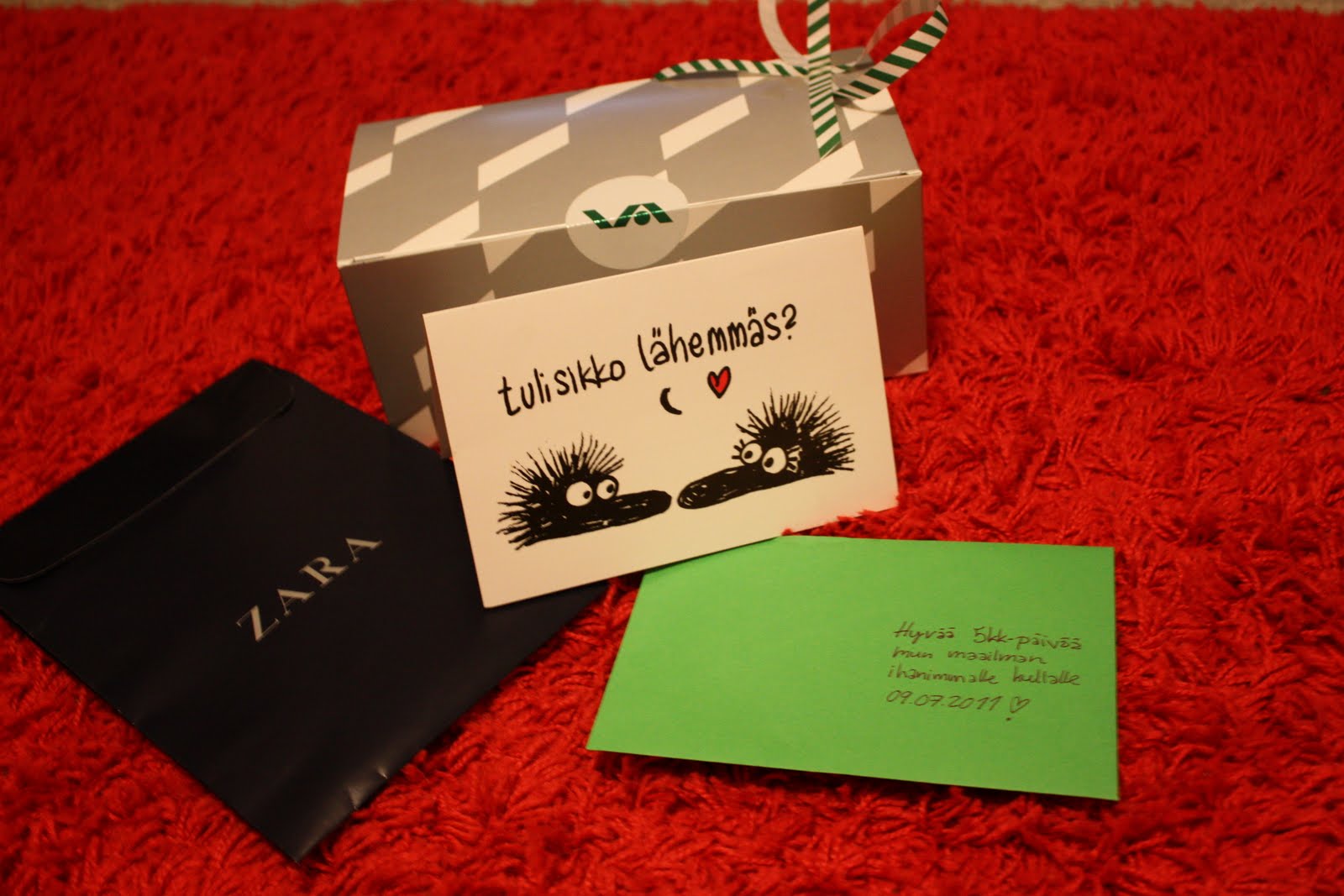 | Tossa on Oton kortti ja paketit jotka annoin sille, ton zaran pussin sisältö näkyy myöhemmin ja toi Stockan paketti jääköön salaisuudeks 😀 buhaha |