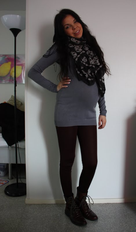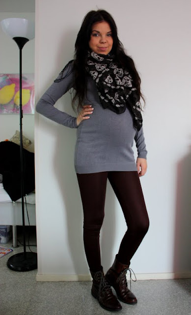 Neule, huivi ja leggingsit: Gina Tricot, Kengät: H&M