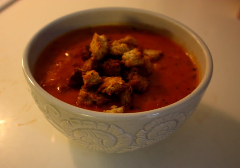 Pekoni-tomaattikeitto & itsetehtyjä krutonkeja