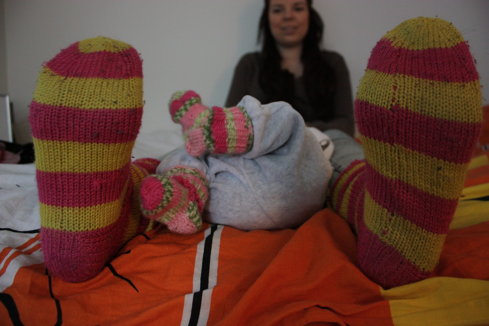 Voi vitsit, mulla on tismalleen samanlaiset villasukat (nytkin jalassa), kun teidän pikkuneidillä! 😀 Tosin ihan hitusen vaan isompaa kokoa. 😉 Mun äidin kutomat. (: