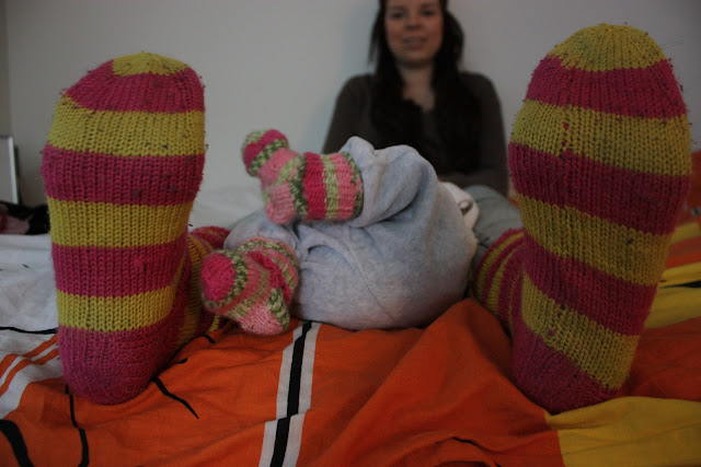 On meillä vähän jalkojen koossa eroa neidin kanssa, ja noikin sukat vähän vääristää kun ne on viel pari senttii liian isot sukkaosista pikkuiselle. No mut hyvin ne lämmittää ja se on pääasia, mitäs pidätte mun ampparijätski-sukista? Nääkin mummon taattua laatua parin vuoden takaa. Mä tykkään et on ilosen väriset sukat, ne on paljon kivempi laittaa kylmänä ja pimeenä talviaamuna jalkaan ku semmoset tylsän harmaat tai mustat. Ei sillä oo niin väliä sopiiko ne muihin vaatteisin, oikeestaan parempi vaan jos ei sovi niin kanssaihmiset yllättyy kun ottaa kengät pois :D.