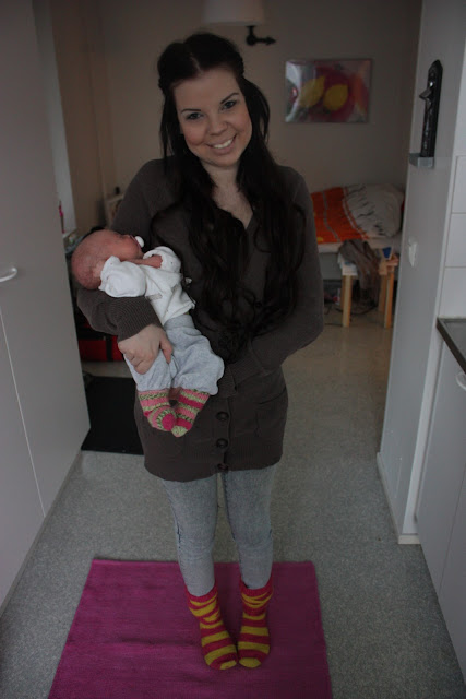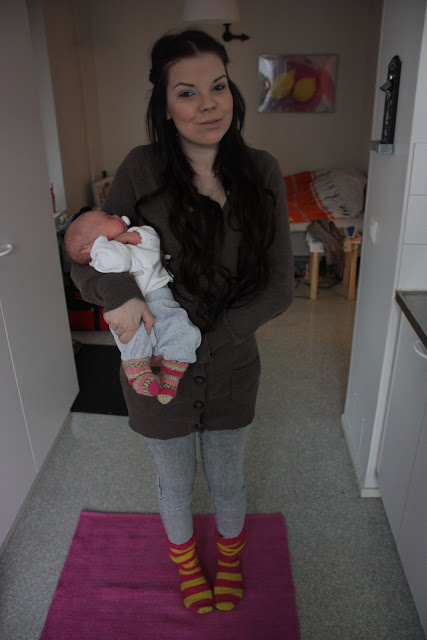 Ansku: Kiitos! 🙂 Mä tykkään muutenki syksystä ja talvesta mut villasukat on kyl niin jees♥ Ja onneksi on ihania mummoja jotka jaksaa kutoa!Anonyymi 23.14: Vuokralla me asutaan toistaiseksi :)PienenTytönÄiti: Ihana ku sun äiti hiippaili salaa!:D Toi on kyl totta et vaik ois kuin läheinen nii raskaus ja synnytys lähentää välejä viel entisestään, niin meilläkin kävi :)Hellu: Se on kaks vuotta sitten H&M:ltä ostettu :)Kisu: On se hyvä olla niit harmaita ja mustiakin, sopii ainakin kaikkien vaatteiden kanssa 🙂 Ja pikkunen nukkuu kyl vielkin tosi paljon, korkeintaan tunnin-pari jaksaa olla hereillä aina syöttöjen aikaan päivisin, oiskohan yhteensä hereil päiväl jonku 4-5 tuntia 😀 Ja ihana kuulla et on läheiset välit äitiin 🙂 Mullekki äiti on yks mun elämän tärkeimmistä ihmisistä, ennen oli tärkeIN mut nykyään ku on kans pikkuneiti ja Otto♥ :)Piipau: Voi kiitoksia, ihana et tykkäsit :)♥ Ja se kyllä lähentää ku muuttaa omilleen, meilki on aina ollu läheiset välit mut sillon vähän ennen ku muutin omilleen nii huomas et molemmat tarvii jo omaa tilaa ja sillon välit oli vähän kireemmät.. Pari viikkoo ku olin asunu yksin nii meil oli tyyliin paremmat välit ku koskaan ennen 😀 Ja joo isän kanssa mulla ei oo välejä ollenkaan.. Rudi: Ihana oot! Mä oon ihan surkee itte neulomaan, kaulaliinan osaan korkeintaan tehdä mut arvaappa jaksanko 😀 Virkkaamista taas en käsitä ollenkaan et miten se tapahtuu, oisinpa mäki noin taitava! 😀 Ja onhan toi pikkuneiti sulonen, toivottavasti siitä tulee yhtä nätti isompana ku teidän Sofiasta! :DJenna: Värikkäät villasukat on kyl kivoi! Ne piristää ees vähän sitä harmaata talvifiilistä :DMm: Kiitos♥ :)Anonyymi 0.01: No en mä tiiä, luultavasti joo koska en tietäis paremmasta.. Onneksi asiat on niinku nyt♥ :)Moona: Kiitos paljon♥ Ja tiiän niin ton fiiliksen että Oulussa asuu paljon läheisiä joita on ikävä, mulla on sama tilanne mut kyl siihen tosiaan tottuu niinkun sanoit ja onneksi lomilla voi aina mennä käymään ja moikkaileen 🙂 Ja Sjoelta on kumminki paljo lyhyempi matka Ouluun ku täältä onneksi 🙂 Minna: Voi oispa meilläkin noin lyhyt välimatka äidin kanssa! :)Anonyymi 0.46: Mun äiti taas ei osaa neuloa ollenkaan, enkä mäkään mut äiti osaa virkata 🙂 Mä en osaa sitäkään 😀 Mullakin oli toi sama ku olin just muuttanu omilleen et hengasin äidillä tosi paljon, varsinkin ku äiti tosiaan sillon asu mun talon viereisessä talossa 😀 Ois kyl ihana jos asuttais niin lähekkäin vielkin :)Piipero: Kiitoksia♥ Onneksi on puhelimet keksitty vaikka sitä välimatkaa onkin! Meki soitellaan monta kertaa päivässä äitin kanssa 😀 Ja ompa kiva että oot sun anopin kanssa noin läheisissä väleissä, mua itseä harmittaa kun en ehtinyt oppia tuntemaan Oton äitiä 🙁