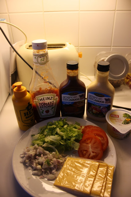 Tänään tehtiin päivällä kävelylenkki Oton ja neidin kanssa tosta surkeasta säästä huolimatta ja käytiin sit hakemassa kaupasta kunnon hampparitarvikkeet. Mä tein itte pihvit ja sit laitettiin kaikkee muuta nannaa sinne väliin. Oli kyl oikeesti tosi hyvää, vaik itte sanonki! Otollekin maistui kuulemma hyvin vaik mua jännittiki et onks mun hampparit mistään kotosin mut onneksi oli.