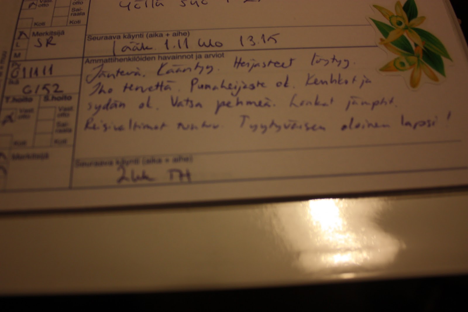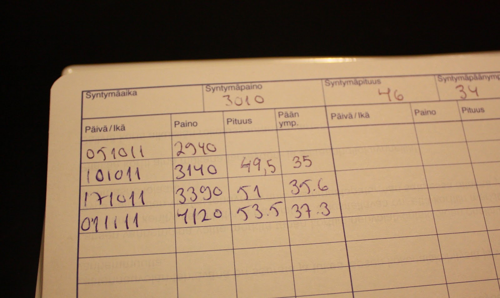 Pakko jakaa sinullekin lausahdus mitä mieheni eilen sanoi nähdessään mun vanhan neuvolakortin: ”toihan on ihan, kun auton huoltokirja.”Teidän lääkärillä on sentään hyvä käsiala toisin kuin mun neuvolakortin kirjoittaneella lääkärillä. Puolistakaan teksteistä ei saanut selvää ja olisi ollut todella kiva tietää miten minua on kuvailtu n. 22 vuotta sitten.