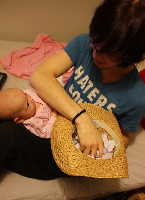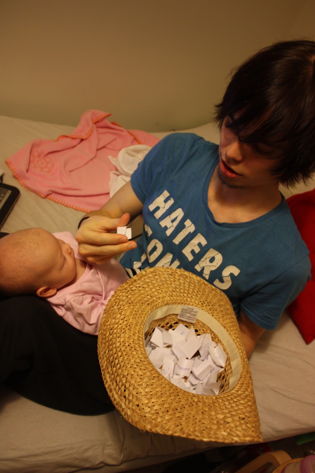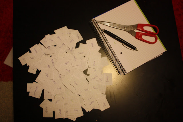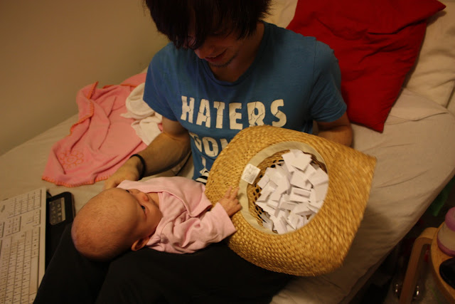 Mä en osaa käyttää mitään exceliä enkä tienny mitää hienoo keinoo miten arpoisin niin kirjottelin sitten kaikkien nimet yhdelle tai kahdelle arvpalappuselle ja lätkäisin lappuset cowboyhattuun mistä Otto sitten onnettarena pikkuneidin kanssa poimi voittaja-arvan.