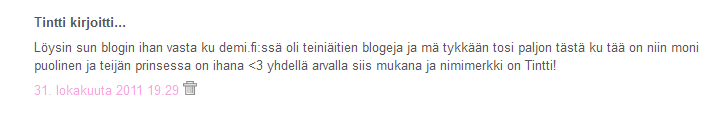 Sini: Mä teen kyl videopostauksenkin viel joku päivä! 😀 Ja saamasi pitää ;Dpikkumyy: No toivottavasti on mieluinen 🙂 Ja ihana kuulla et tykkäät 🙂 Toivottavasti pysyt jatkossakin meidän mukana! :)♥Anonyymi 19.52: Kuuntelin ton dodo sorsa tänää, aivan super ihana biisi! Kiitti vinkistä :)Anonyymi 19.56: No mä aattelin et ku en oo koskaan ennen pitäny minkään näköstä arvontaa nii piti vähän panostaa 🙂 Ja mulla on muutenki nii ihanat lukijat et mielellään mä vähän panostan :))♥Henna: se on varmasti hyvä idea et hankkii jotain tuutulaululevyjä, monet vauvat tosiaan rauhottuu niihin. 🙂 Meillä vauva jää ilman musiikkia tai mitään virikkeitä aina illalla omaan sänkyyn ku ollaan kotiinpääsyn jälkeen tehty joka ilta silleen, sinne se sit nukahtaa omia aikojaan kiltisti 🙂 Meillä musiikki on enemmän semmonen juttu et päivällä ku vauva on virkee nii sit kuunnellaan musiikkia ja höpsötellään ja mä itekki laulelen sille vaikken yhtään osaa laulaa :DLoora: No kiva et huomaa koska te ootte oikeesti mulle tosi tärkeitä ja mä arvostan teitä :)♥ Ja pikkuneiti on kyl sulonen ja ihana, voisin vaa tuijotella sitä kaikki päivät ja yöt enkä nukkuu ollenkaan :DDAnonyymi 20.09: Haha se tykkää työntää aina kieltä ulos suusta 😀 Ja smurffit on ihan parhaita! :DMm: Tolla pikkuneidillä on aina kieli ulkona suusta 😀 Varsinki jos on ruoka-aika lähestymässä 😀 Ja muumibiisejä pitäs meilki alkaa soittamaan, pitää ettiä youtubesta ne 🙂 Ja se on varmana kyl pienen mielestä hauska se kohta ku se on siinä on toistoa tai silleen ku ne muut sanat ei oo nii jännii tai semmosii korvaan hassun kuulosii 😀 Ihana kans toi nallepuh-laulu! :DPiipero: Kuuntelin ton dodo-sorsan ja aivan hurmaava biisi kyl, niin sulonen! Ja mä tiesin robotti vipusen levylt sen vipusen vesivahinko -biisin, se on kans ihana 😀 Ja ei sitä aina kerkee ja ei se mitää, mut ihanaa aina kun jaksat silti kommentoida vaikka onkin kiireitä 🙂 Toivottavasti teidän poika paranee pian♥ Ja kiitos paljon♥♥ :)Aino: Kiitos :)♥ Mullaki oli monta levyy smurffeja, ne on just jees 😀 Ja nyt tuli bilemeikkipostaus, mut ei videolla ;(Anonyymi 21.09: Voi kiitti :)♥ Bilemeikin tein! Ja mä arvostan teitä tosi paljon, ihana jos oon onnistunu näyttämään sen :)♥Anonyymi 21.34: Aww, no on se kyl munki mielestä sulosin mut mä oonki puolueellinen ku oon sen äiti :D♥ Kiitos paljon ja kaikkea hyvää sulle♥Anonyymi2 21.34: Kiitos♥ Ja hyvä idea! Toi bilemeikki jonka tein on kyl kans ehkä mun lempparimeikki ku mä viihdyn sillon ku on paljon meikkiä :DDEunukki: Muumitunnari on kyl jees ja itelki tuli titi-nallee katottuu 🙂 Ja toi dodo-sorsa on kyl nii sulonen ja siinä on ihanat sanat, varmaan mäki alan lauleleen tota :DAnne: Moi äitiliini♥ Nii fröbelin palikat! :DD