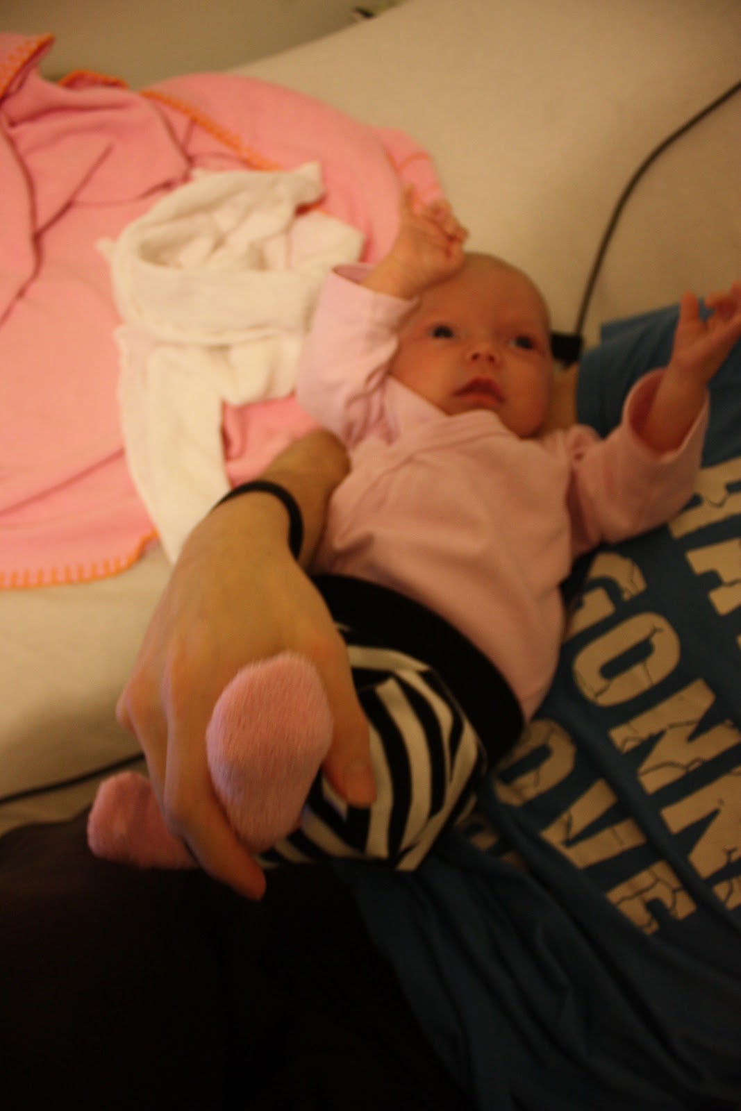 Ja sitten niitä neuvolakuulumisia! Tänään meillä oli siis neuvolalääkäri ja kaikki oli oikein kunnossa. Pikkuinen sai kehuja jäntevyydestään ja rauhallisuudestaan. Kaikki heijasteet kuulemma tuli hienosti ja neiti otti monen monta askeltakin kävelyheijastetestissä. Päätäkin kannatteli jo hienosti ja kääntyi vatsalta selälleen. Neiti kasvaa hyvää vauhtia ja alkaa kuulemma saavuttaa jo samanikäisiään kasvussa vaikka olikin syntymäpainoltaan pikkuruinen. Tämmösiä merkintöjä tuli neuvolakorttiin: