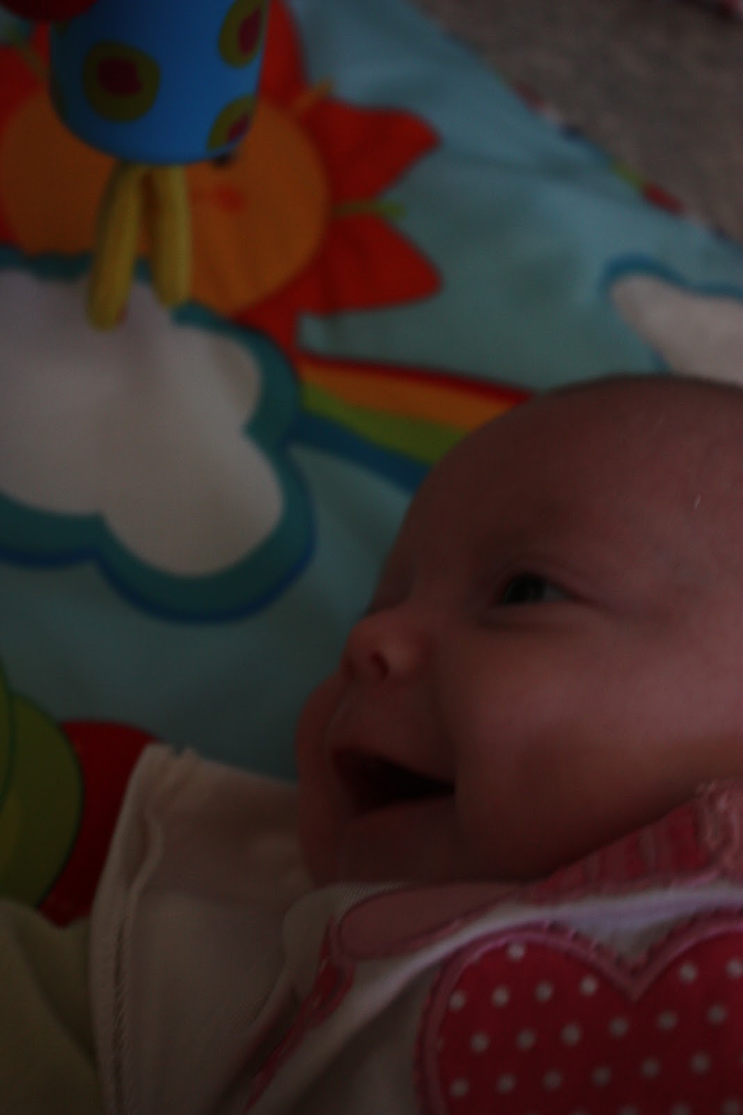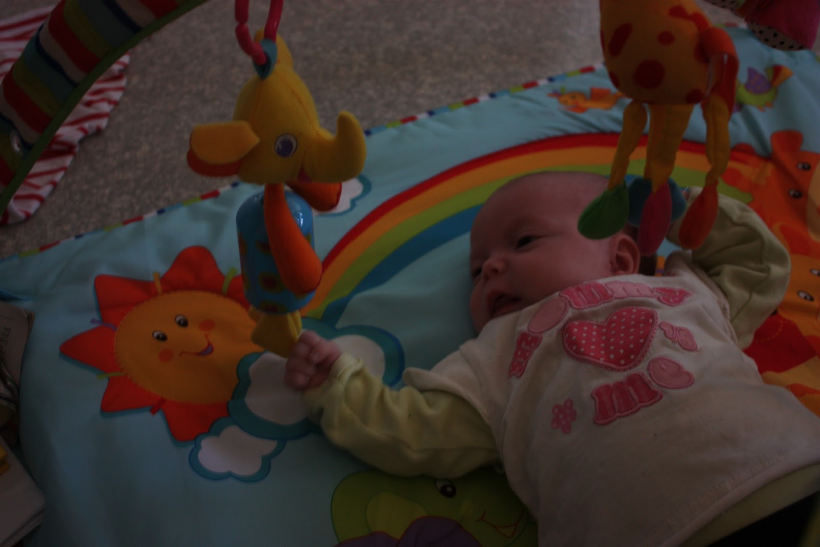 Sitten vähän vauva-asiaa, meidän pikkuinen 7 viikkoa eilen täyttänyt neiti oppi tänään et lelukaaren norsusta kuuluu kiva ääni kun siihen huitoo! Mitä mun pienelle seiniä tuijottavalle rääpäleelle on tapahtunu?! Tänään myös varmistui se et se ei oo vahinko jos neiti kääntyy masulta selälleen vaan se ihan oikeesti osaa, koska laitoin sen masulleen monta kertaa leikkimatolle ja joka kerta käänty itse selälleen. Tietty noinpäinhän se on paljon helpompaa mut saas nähdä koska sitten kääntyy selältä masulleen. Tässä vähän vauvakuvia ja lopussa viel video neidin huitomisesta ft. ylpeä äiti!