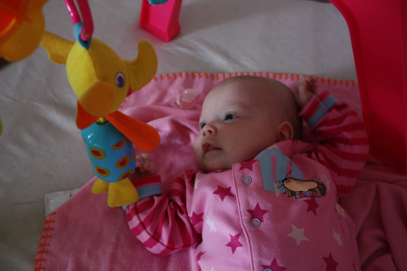 Ja sitten toi pupu-asia. Vaikka meidän lapsi on tottakai maailman fiksuin ja filmaattisin ja ihanin niin se ei kyl oo vielä niin fiksu että se osais laittaa pupua suuhun tai edes tarttua siihen kunnolla, enemmänkin tyytyi ihmettelemään ja kattelemaan sitä. Ja kyllä, aion pestä sen pupun tässä kunhan tulee muitakin pyykkikavereita pupulle mut en mä nyt todellakaan ala stressaamaan et voi kamala nyt meidän neiti on maannu samassa sitterissä paketissa tulleen pupun kanssa jota ei oo vielä pesty. Jos joku näin toimii nii ihan vapaasti mut ei kuulu mun tapoihin.