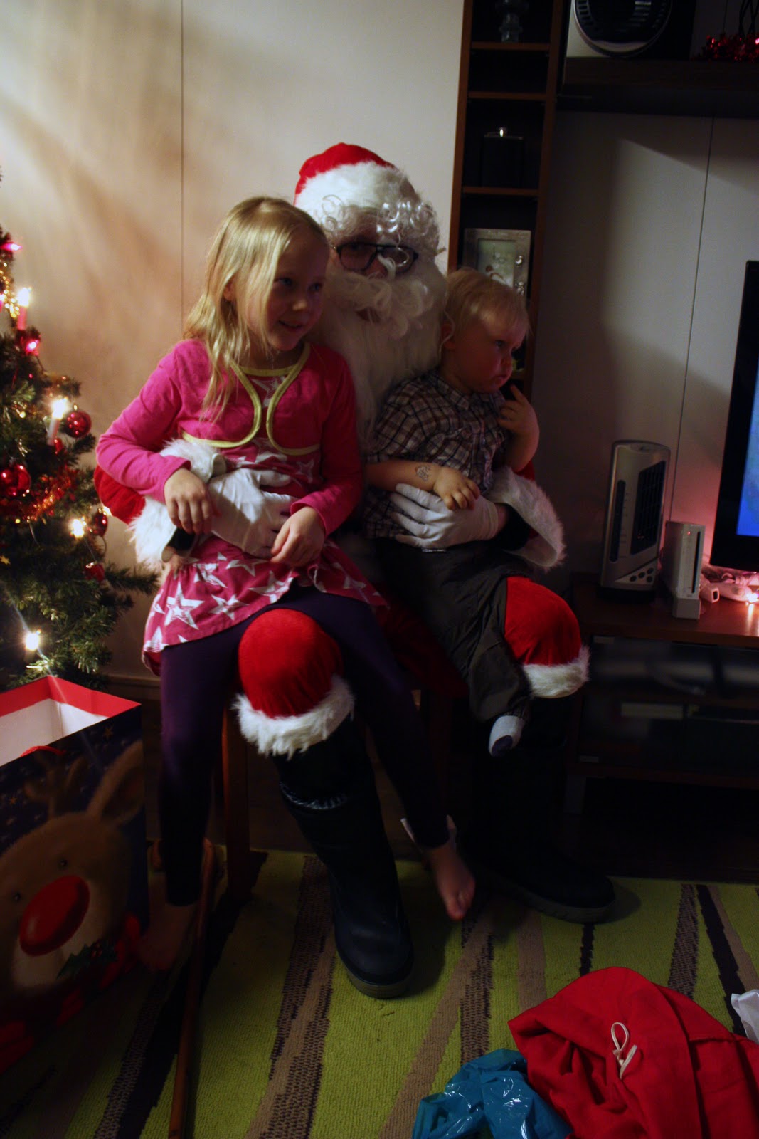 | Toi meidän joulupukki oli niin hellyyttävä tapaus ku oli partakarvatki jääny silmälasien alle solmuun eikä se oikeen nähny kunnolla mitä paketeissa luki :—-D |
