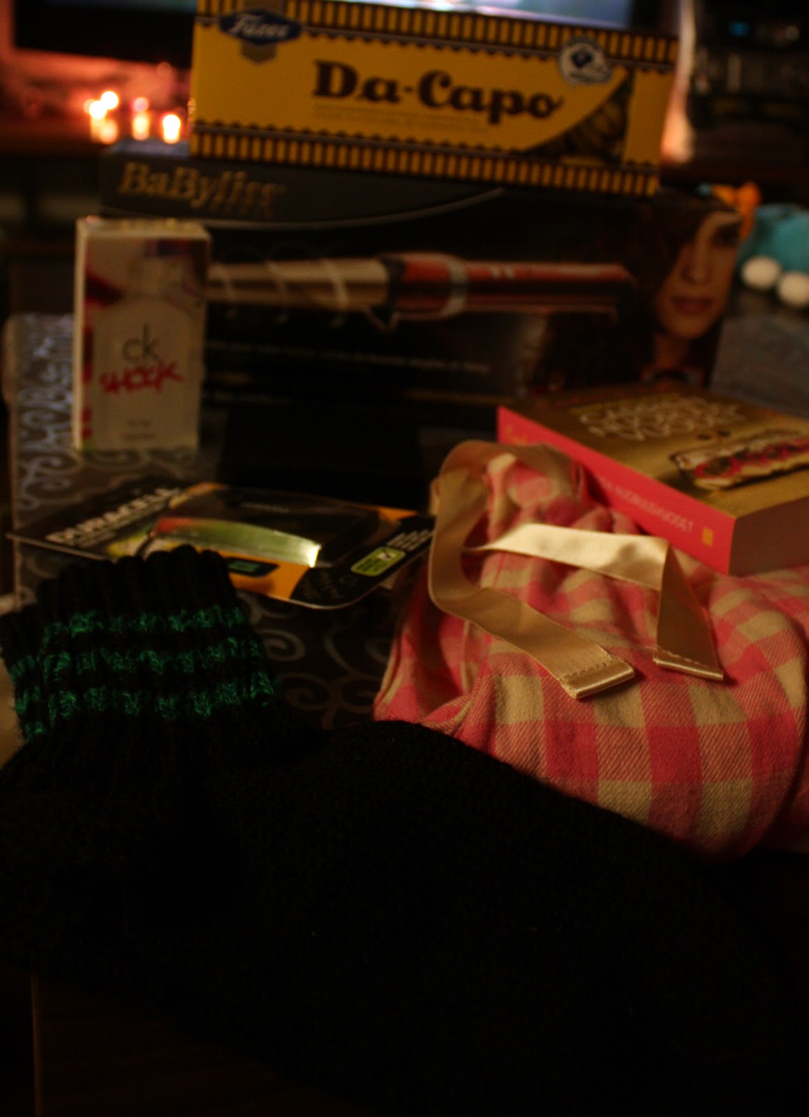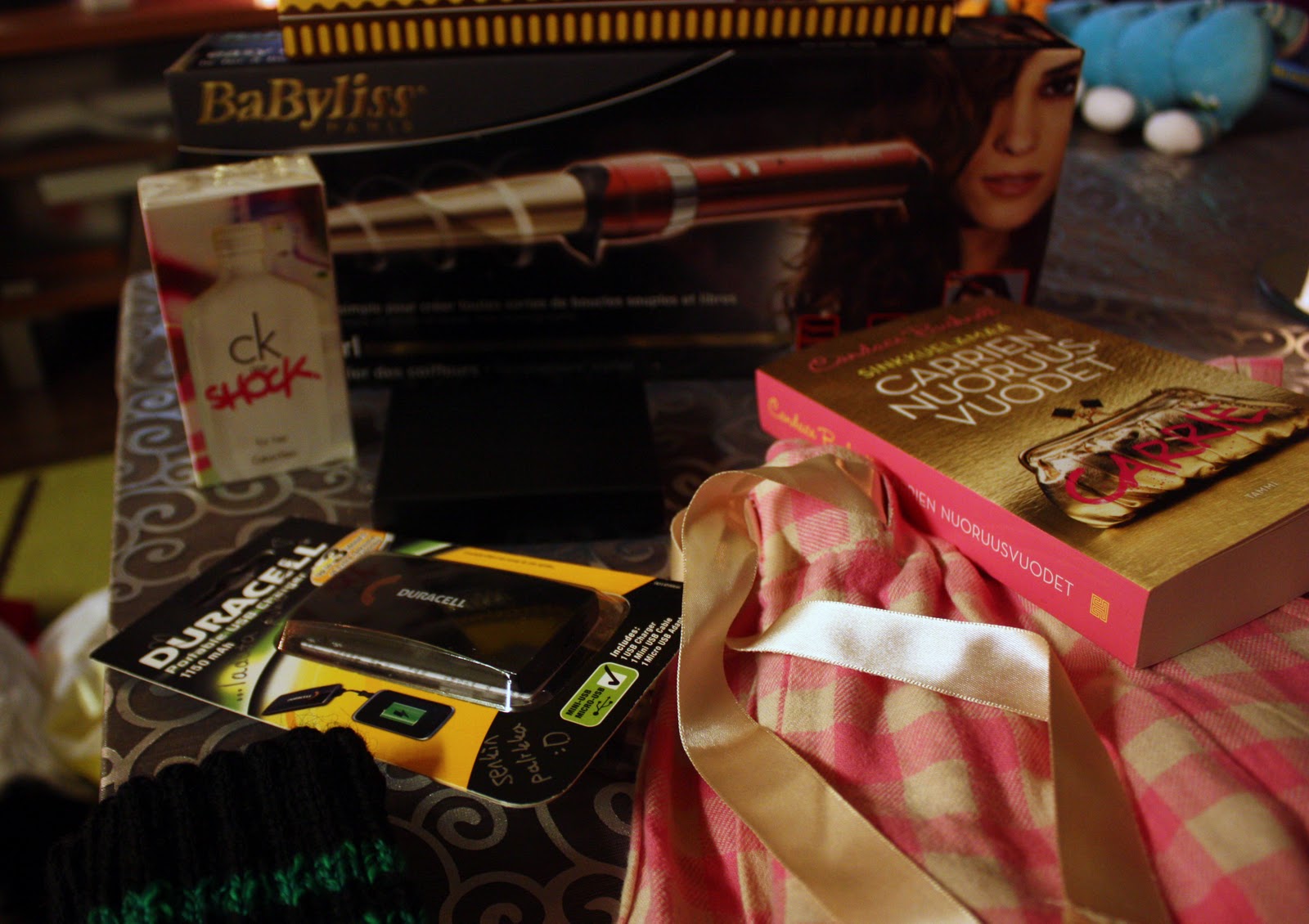 | Dakapo-rasia, Babylissin sauvakiharrin, Calvin Kleinin One SHOCK -hajuvesi, kannettava akkulaturi puhelimeen (ku en kuulemma koskaan muista ladata sitä ja sit loppuu akku :D), Carrien Nuoruusvuodet -kirja, Zaran lahjakortti, ihanat pinkit unelmanpehmeät pyjamahousut ja lämpöiset villasukat |