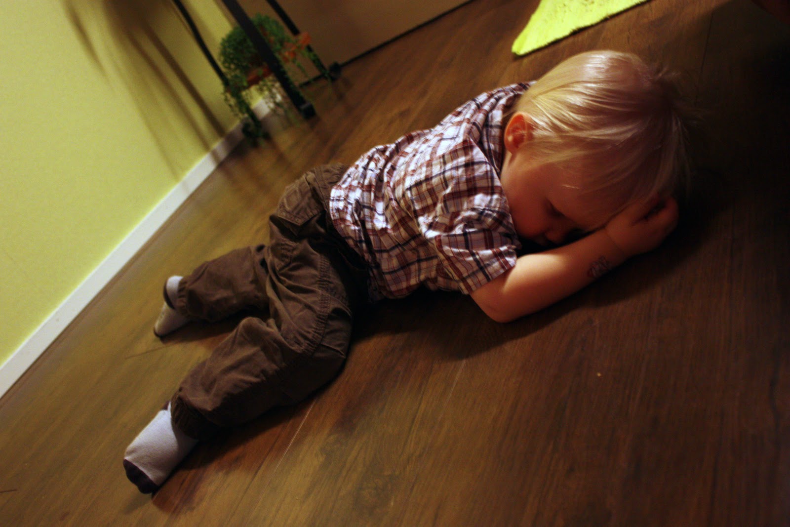 Voi että! Meidän pikkuneiti (2-vuotias) ei suostu iltaisin millään menemään nukkumaan, vaikka sitä kuinka käskettäis, mutta sitten joku aina hetken päästä huomaa, että tyttö on nukahtanu lattialle samalla tavalla kuin tuokin pieni tuossa kuvassa. 😀