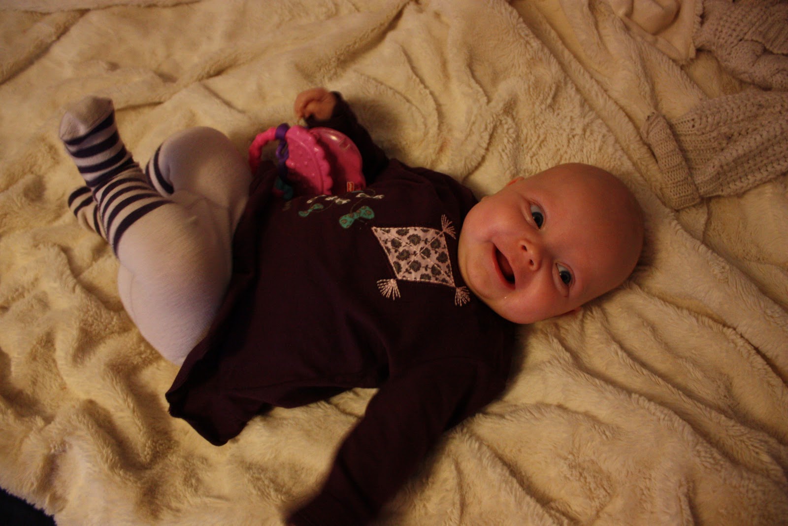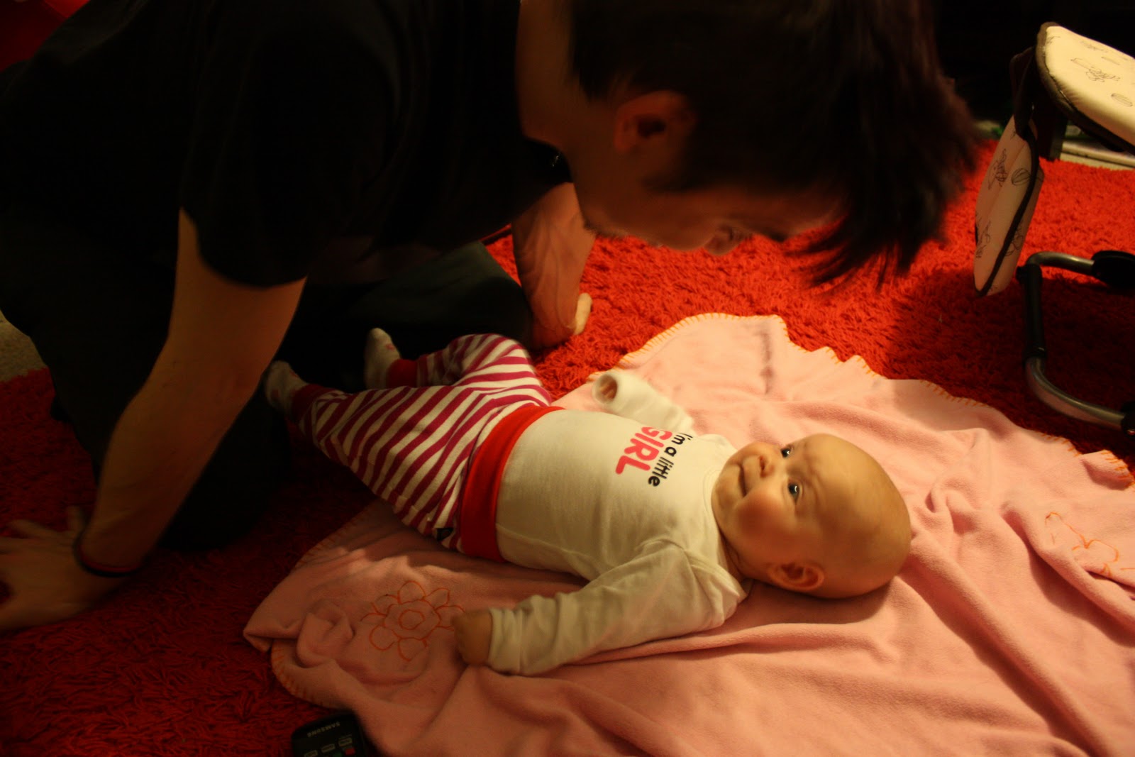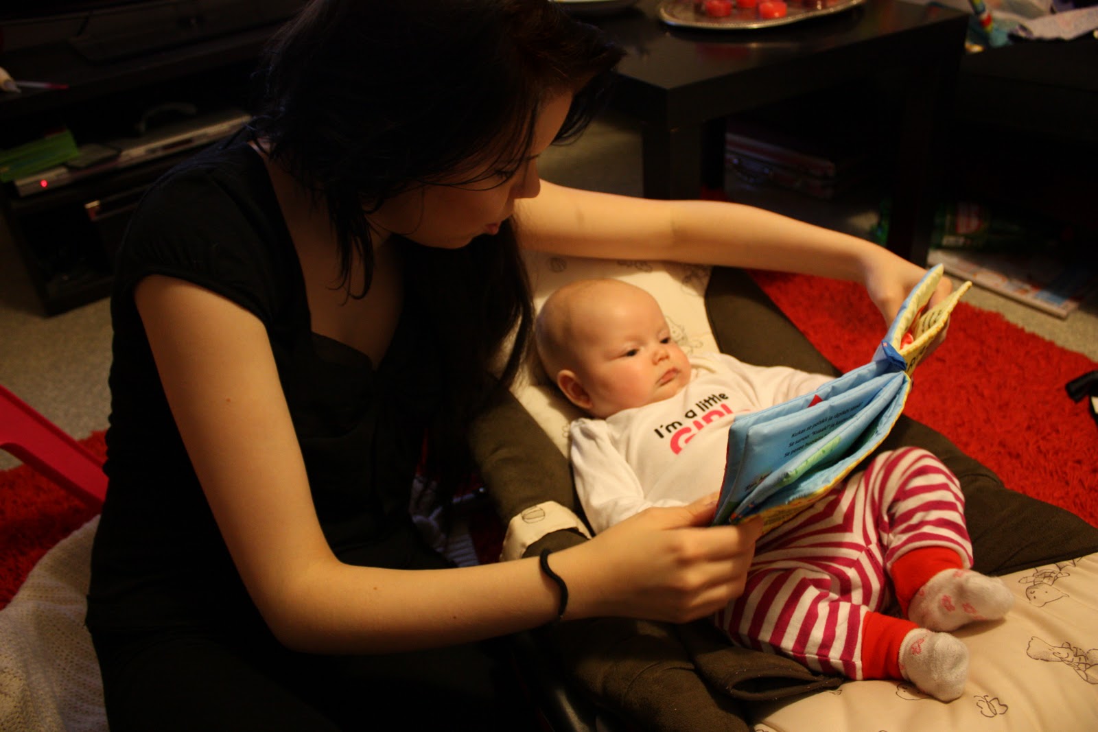 Mutta sit mä voisin kertoakin vähän meidän viikonlopusta. Kuten tavallista, ollaan lähinnä hengailtu kotosalla. Eilen tosin tapahtui jänniä kun mun vanha kaveri Vilma jonka kans ollaan tunnettu ekaluokalta asti tuli käymään meillä moikkailemassa mua ja Tirriskää. Oli kyl niin mukava vaihtaa kuulumisia pitkästä aikaa ja jutella niitä näitä (sekä juoda yliannostus supersokerista kahvia ja pilata sillä yöunet). Räpsittiin kuvia ja leikittiin ton ihanan neitokaisen kanssa joka onnessaan selitti meille ummet ja lammet. Musta tosin tuntuu et Tiara on alkanu vähän vierastamaan ku niin epäluulosesti katteli aluksi uusia kasvoja ja vasta vähän ajan kuluttua alkoi iloisesti selittämään. Mut eiks se tässä 4kk pintaan tuu se vierastusvaihe vai oonko ihan väärässä? Nojaa, mut voisin laittaa muutaman kuvasen eiliseltä: