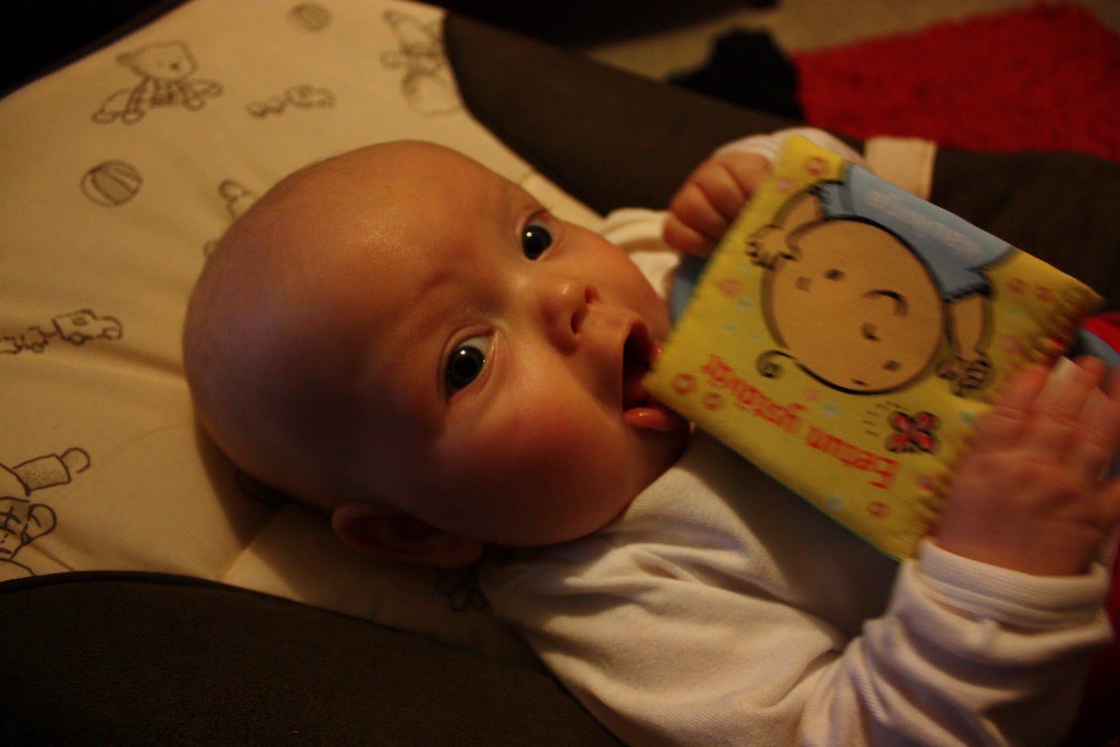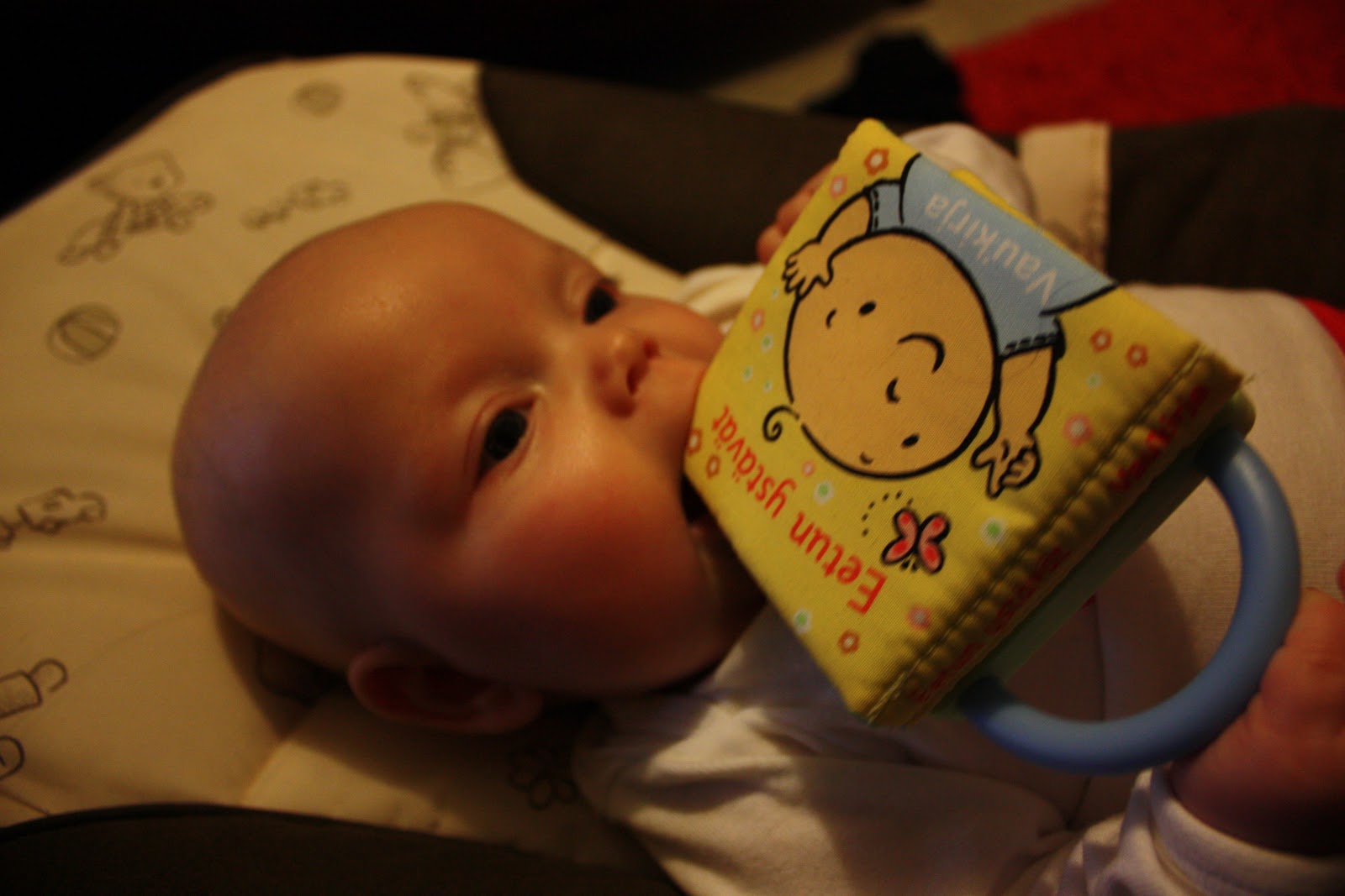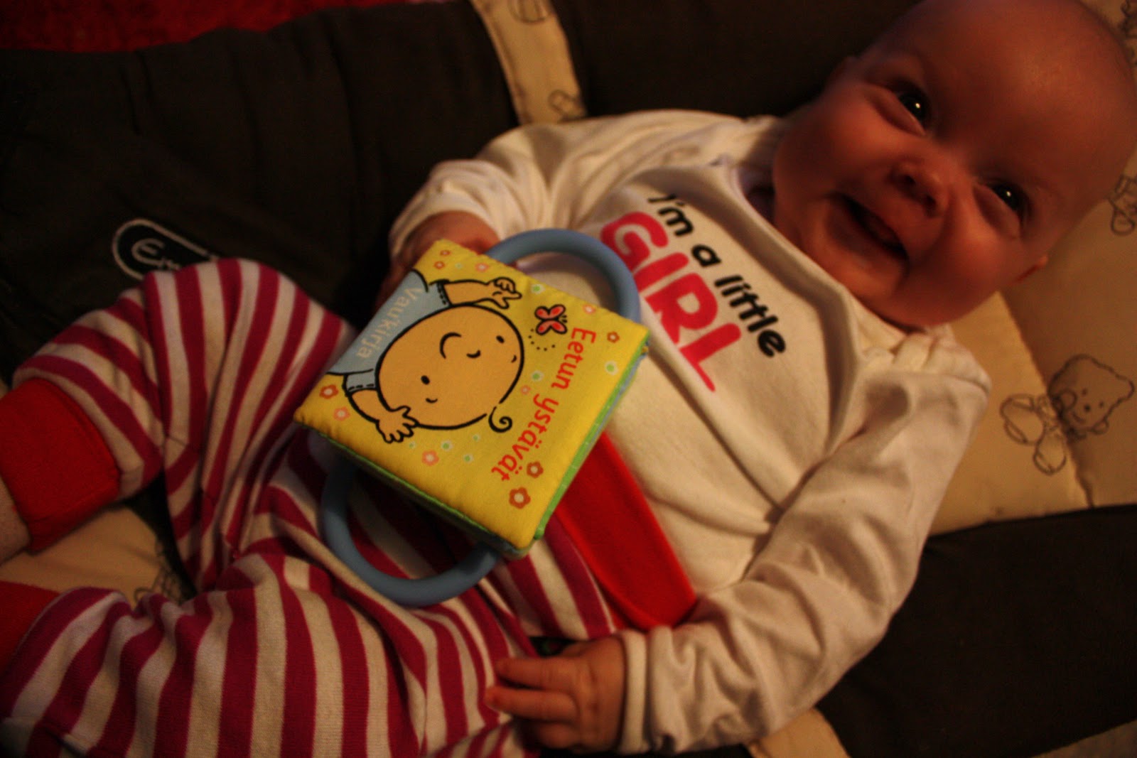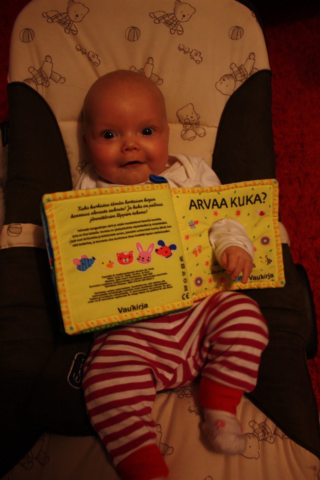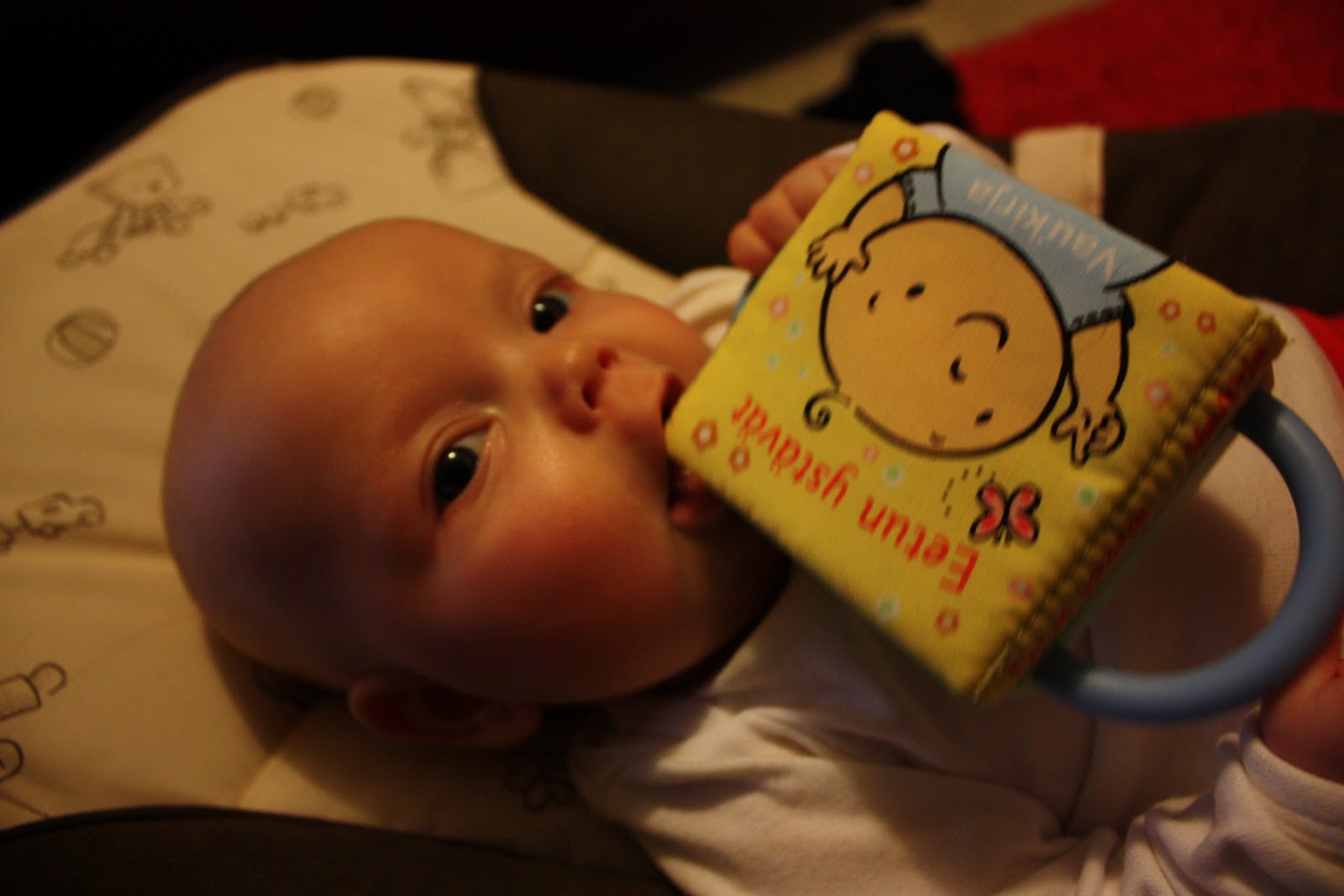 Se hihkuu onnesta ku käännän sivua ja sieltä paljastuu kirkkaan pinkki pupu ja hauskoja on myös rapisevat kirjansivut sekä minipehmokirjan takana oleva helisevä peili. Kaikkein eniten neiti kuitenkin rakastui tänään kirkkaanpunaseen tortillasipsipussiin jossa oli rapisevia sipsejä vielä sisällä. Ensin sen huito sitä kun istuin sohvalla ja se makoili mun viekussa mut sitten annettiin se sille käteen ja se rutisteli ja rapisteli sydämensä kyllyydestä. Ei taida olla mikään urbaanilegenda se et lasten mielestä kivoimpia leluja on ihan normaalit asiat joita ei ees leluiksi ole tarkoitettu.