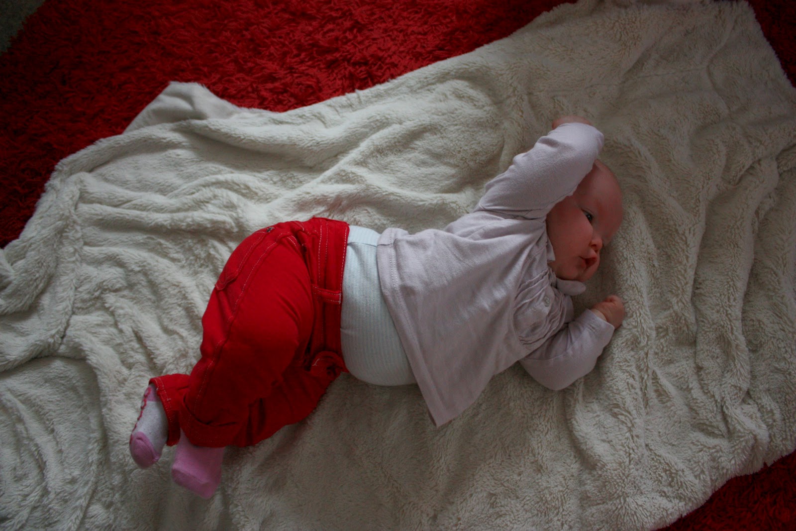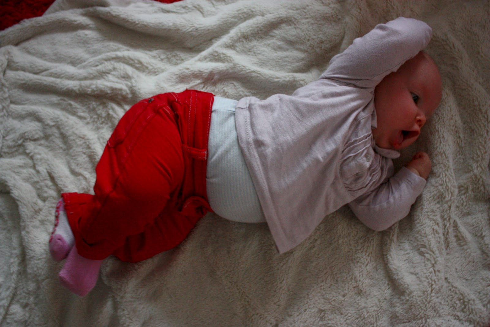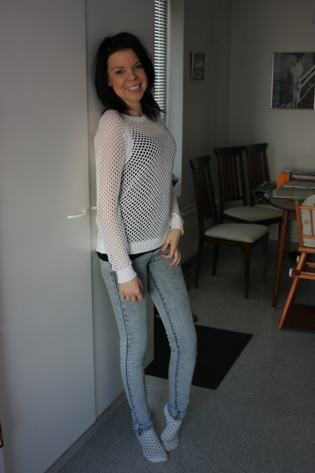 Eilinen sunnuntai meni ihan kotona löhöillessä ja neidin kanssa leikiessä. Ainut mikä tässä nyt varjostaa sekä leikkimistä että postailua on mun käteen taas kerran ilmestynyt rasitusvamma. Mulla on jostain 15-vuotiaasta asti aina tasasin väliajoin tullu ranne tosi kipeeksi, niin ettei sitä voi taittaa tai liikuttaa. Tää kipu kestää jonkun vajaan viikon ja sen jälkeen menee taas ohi ja tulee muutaman kuukauden päästä takasin. Mä oon käyny lääkärissäkin monta kertaa mutta mun kädestä ei oo löytyny mitään vikaa. Mulla ei koko raskausaikana ollu kertaakaan käsi kipeenä ja aattelin jo päässeeni eroon tästä hommasta, mutta mitä vielä; eilen se kipu sitten alkoi taas ja nyt ku oon tässä naputellu koko neidin päikkäriajan niin voin kertoa että tällä hetkellä en ollenkaan rakasta mun kättä. Mä en voi käsittää mistä toi johtuu, esimerkiksi viime viikolla mä en ollu koneella paljoa ollenkaan joten se ei voinut tulla siitäkään ja silloin kun vielä opiskelin parturi-kampaajaksi niin se käsillä tekeminen ei mitenkään edesauttanut tota kipua, tai et mulla ei tullu käsi mitenkään useemmin kipeeksi sen takia tai mitään. Tää on vaan tosi kummallista ja ärsyttävää mutta onneksi tiedän että tän pitäis mennä muutamassa päivässä ohi, ellei raskaushormonit sit oo muuttanu tätä joksikin aggressiiviseksi kädensyöjätaudiksi, who knows. Mutta tässä kuvia vielä mun eilisen löhöilyasusta, kipeestä kädestä ja parista ihan o