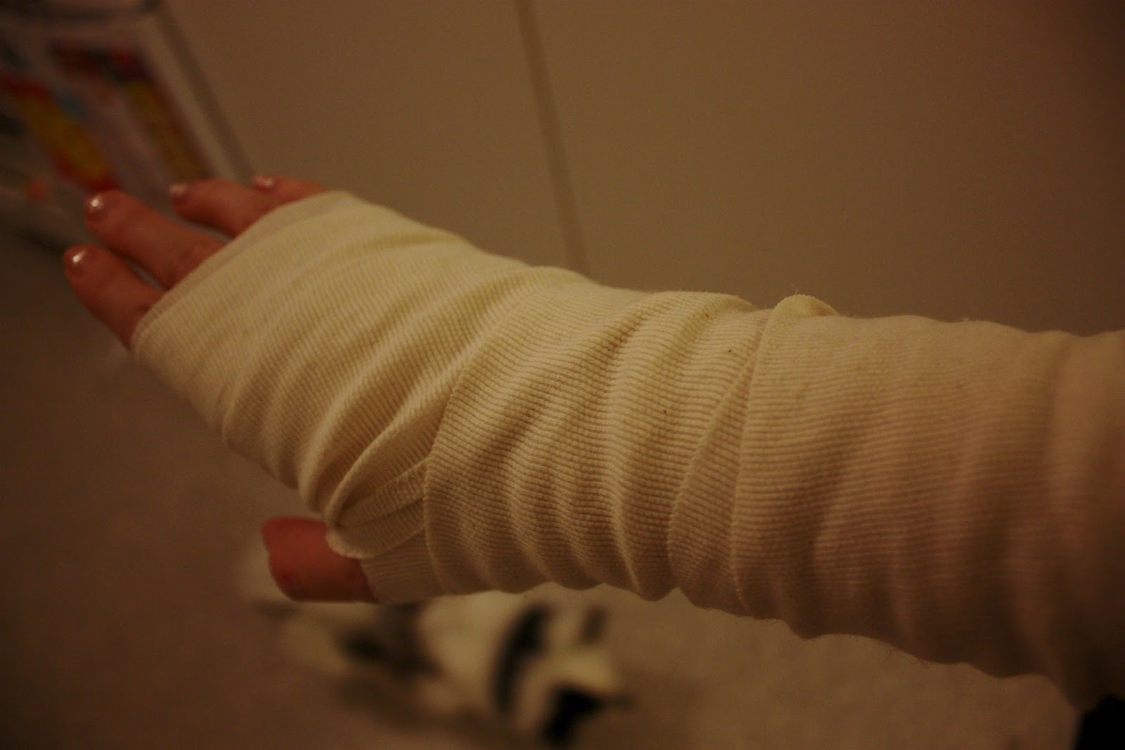 Tässä on mun käsi-raukka! Ihan tyhmää pitää tommosta rumaa sidettä! No, jospa se siitä taas paranis..