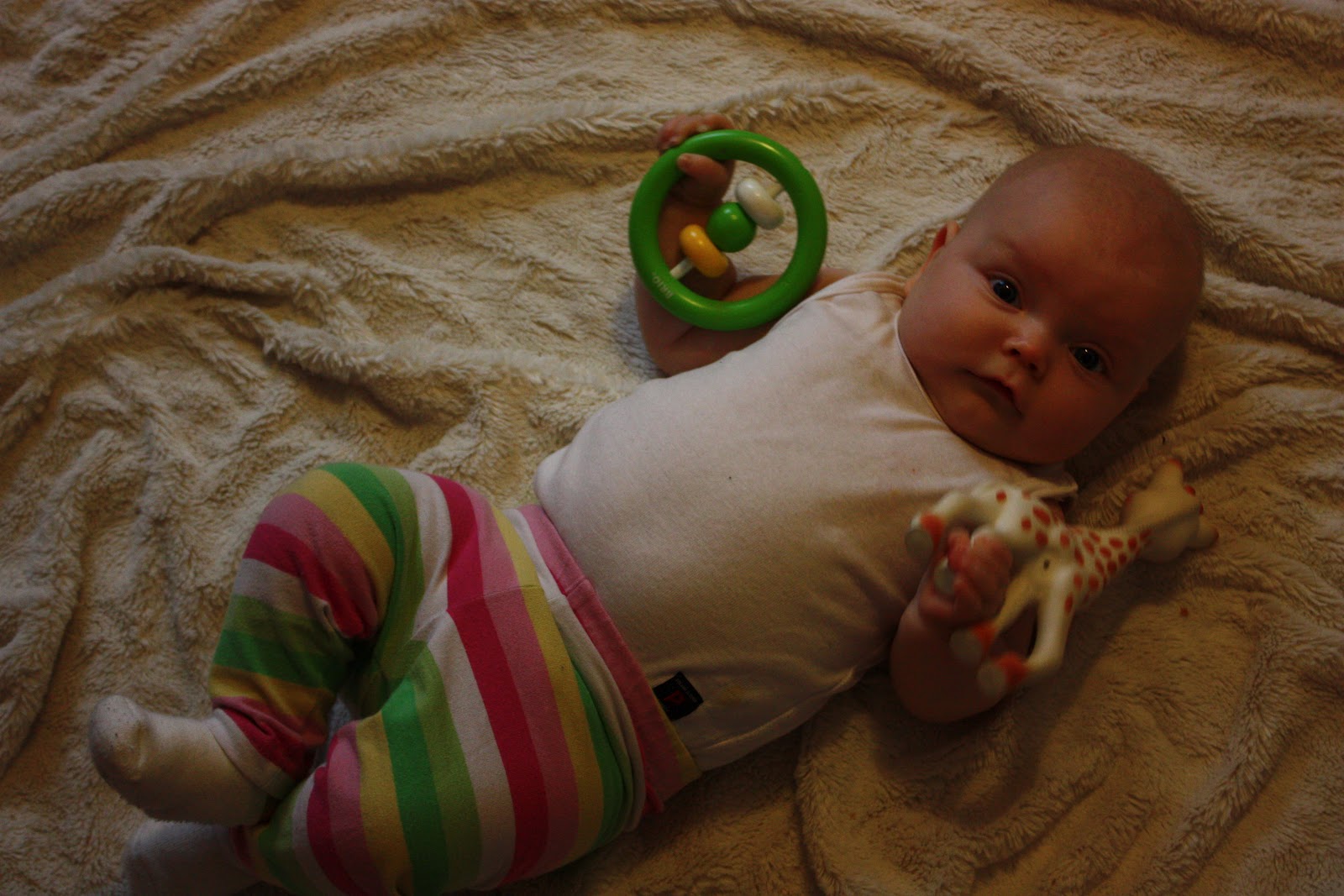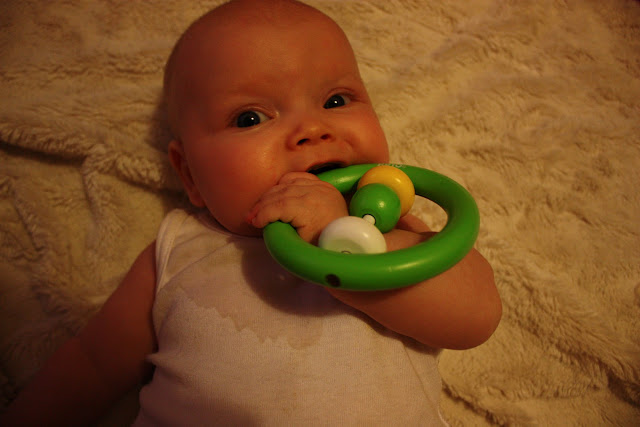 Tää viikko, tai oikeastaan toi yksi maanantaipäivä oli ihan hullu! Tiara oppi saman päivän aikana kääntymään kunnolla masulleen ja päristämään kielellä. Siitä asti meillä on sylki lentänyt kokoajan kun neiti päristelee niin maan perkeleesti, kuinka söpö voi toinen olla? Noiden lisäksi Tiara on päättänyt että nyt on se hetki kun lattialla makaaminen ei enää riitä, vaan pitää päästä eteenpäin. Ennen neiti makoili masulleen tyytyväisenä ja tuijotteli leluja tai söi nyrkkejä, nykyään masulleen ”makaaminen” on yhtä ryömimisyritystä, pylly nousee ylös, jalat menee koukkuun alle, käsillä vedetään peitosta, jaloilla potkitaan vimmatusti ja tuloksena päästään pari senttiä suuntaan tai toiseen. Pari senttiä ei riitä Tiaralle, sitten se luovuttaa, syö hetken nyrkkiä ja aloittaa saman homman alusta. Onneksi vielä ei oo tullut ainakaan mitään turhautumiskiukkuja siitä ettei neiti pääse eteenpäin vaan se on aina kiltisti luovuttanut ja yrittänyt sitten uudestaan.