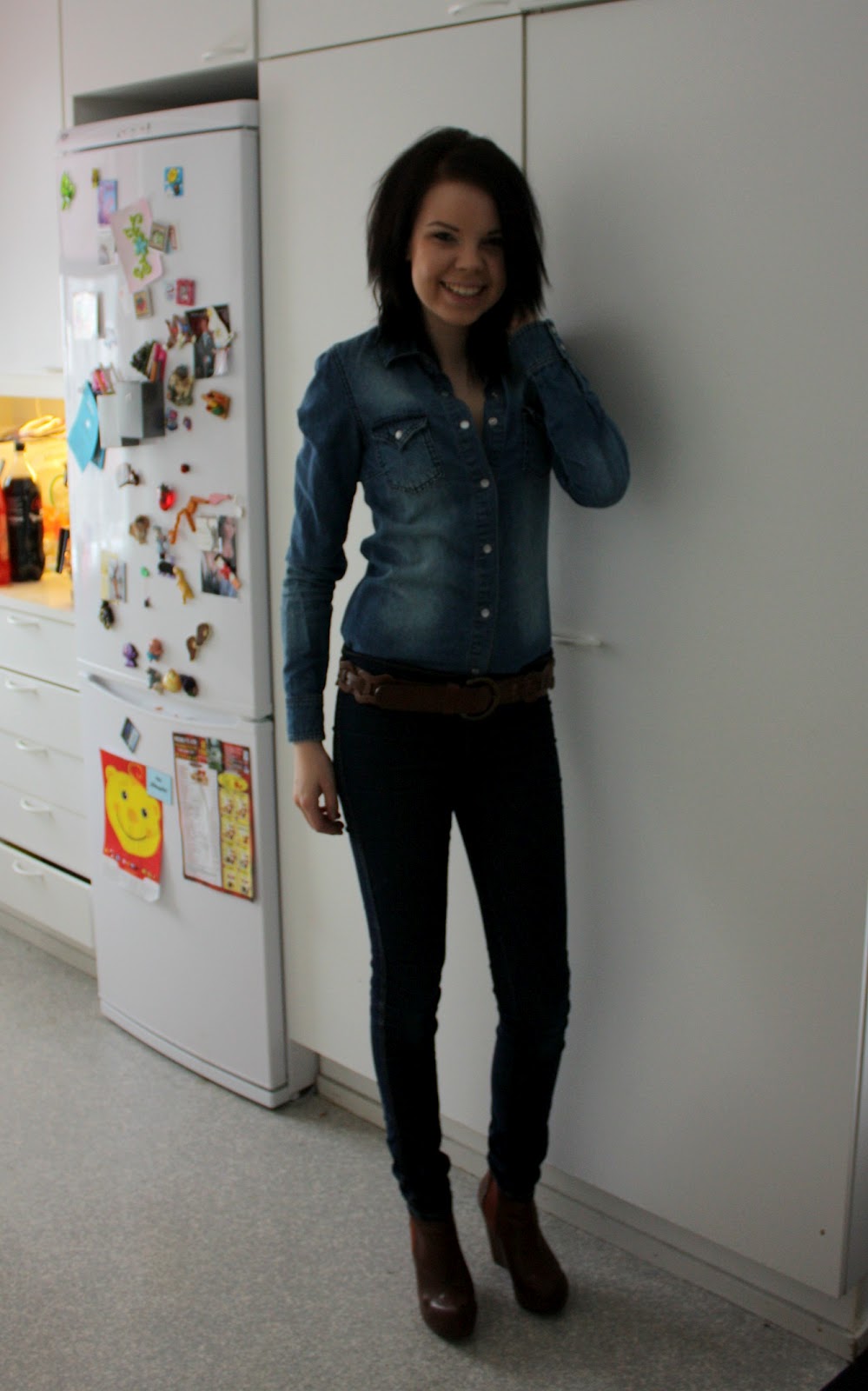Ystävänpäivänä käytiin siis Oton kanssa lounaalla Cafe Picnicissä, vähän kanapatonkia napaan ja silleen. Äiti nappasi musta pari päivän asu -kuvaa ja itse otin pitkästä aikaa muutaman pärstäkuvankin jopa. Löysin mun farkkupaidan pitkästä aikaa, muistan kun kokeilin sitä päälle joskus ihan synnytyksen jälkeen ja sain napit vaan vaivoin kiinni, nyt se meni päälle taas ilman mitään ongelmia. Mittasin tästä innostuneena mun vyötärönympäryksen, synnytyksen jälkeen se oli 72cm (!!!) mutta nyt vyötärökin on vihdoin palautunut ja mitta oli jo vähän miellyttävämpi 60cm, vielä ois sentti matkaa synnytystä edeltäneeseen mittaan. Mutta tässäpä olisi ”muutama” kuvanen:
