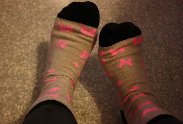 Nää sukat on ihan rakkautta! Mä en muista edes milloin olisin viimeksi ostanu uusia sukkia itelleni, varmaan vuosia sitten. Siitä johtuen mä oon käyttänyt vaikka kuinka kauan jo eriparisia sukkia jotka on ties minkä värisiä ja nyt sitten päätin kerrankin repästä kun löysin noin suloset sukat ja oon maailman tyytyväisin! Sukat on vaan yleensä sellanen asia jota mä en edes ajattele, pakollinen paha, mut näitä mä voisin käyttää vaikka perkele sandaalien kanssa! No en sentään, mut on nää aika söpöt.