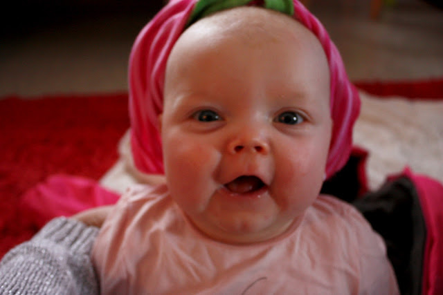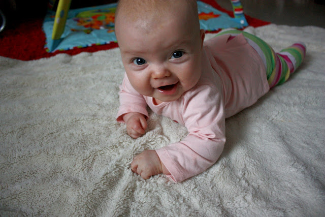 Tiara jatkaa edelleen ryömimisharjoituksia, enemmän ja vähemmän menestyksekkäästi. Eiköhän se muutaman viikon päästä jo etene pari senttiä enemmän? Vaikka ei tässä mikään kiire ole, mutta sen verran mallikkaasti neiti jo potkii että luulisin oppimisen sujuvan nopeasti tässä asiassa. Nyrkin syöminen on muuten vähentynyt meillä huimasti, hassua sinänsä. Tiaralla on niin kova tarve mölistä ja kiljua että ei siinä kerkeä nyrkkiä mussuttaa kun on niin paljon asiaa!