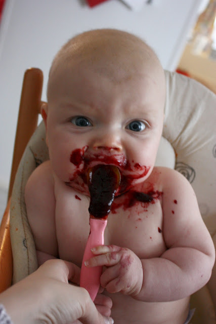 Tiara tykkäsi mustikasta alkujärkytyksen jälkeen kuin hullu puurosta mutta oli kyllä suihkun ja kylvyn paikka kun sotkua tuli varmaan seittemän kertaa niin paljon kuin yleensä! Mutta eipä se sotku mitään haittaa, mä en ainakaan oo turhan tarkka 🙂