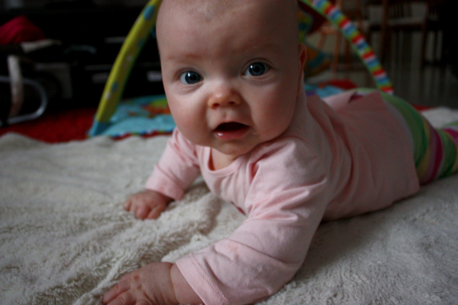 Tiara jatkaa edelleen ryömimisharjoituksia, enemmän ja vähemmän menestyksekkäästi. Eiköhän se muutaman viikon päästä jo etene pari senttiä enemmän? Vaikka ei tässä mikään kiire ole, mutta sen verran mallikkaasti neiti jo potkii että luulisin oppimisen sujuvan nopeasti tässä asiassa. Nyrkin syöminen on muuten vähentynyt meillä huimasti, hassua sinänsä. Tiaralla on niin kova tarve mölistä ja kiljua että ei siinä kerkeä nyrkkiä mussuttaa kun on niin paljon asiaa!