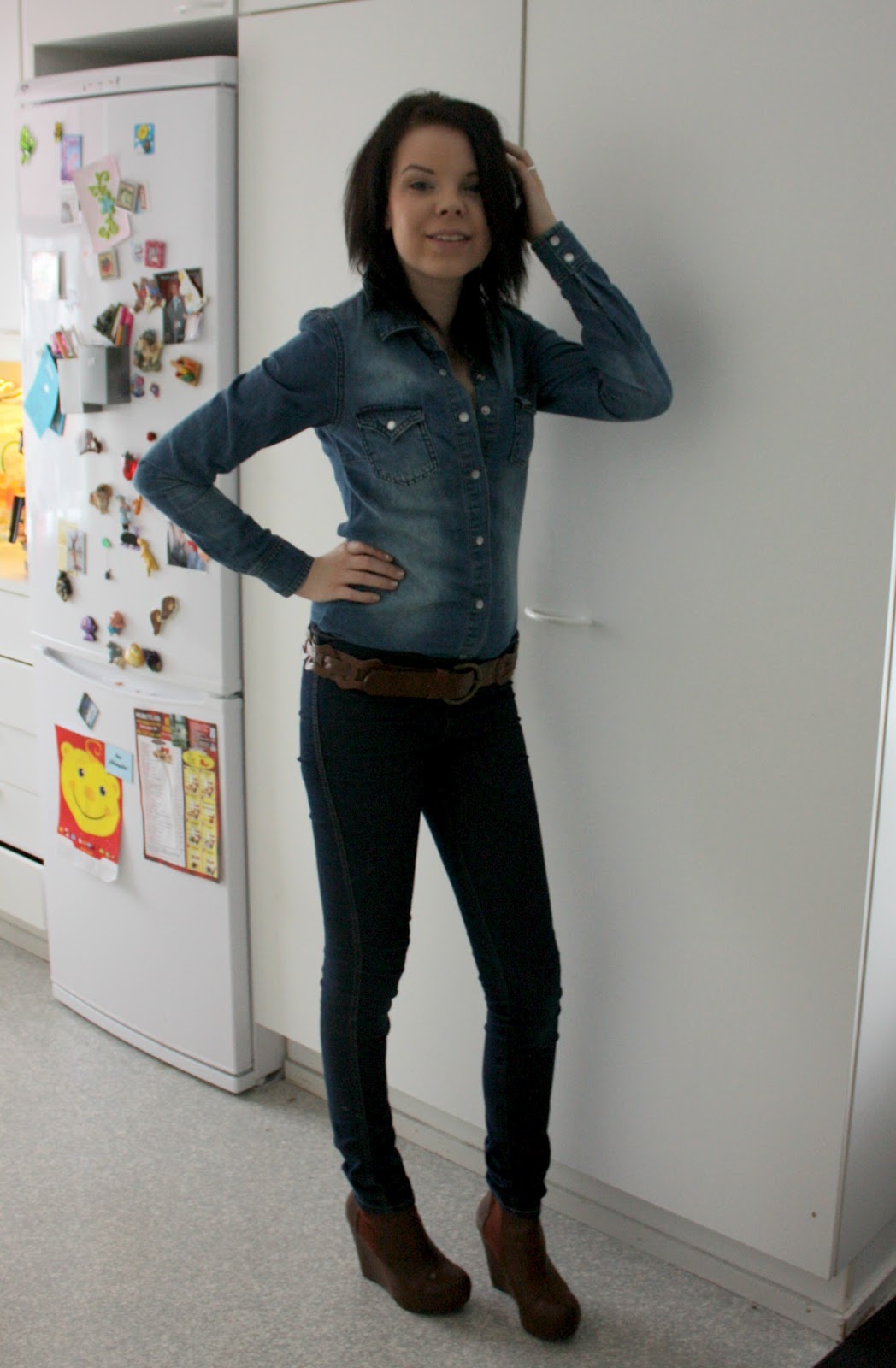 Ystävänpäivänä käytiin siis Oton kanssa lounaalla Cafe Picnicissä, vähän kanapatonkia napaan ja silleen. Äiti nappasi musta pari päivän asu -kuvaa ja itse otin pitkästä aikaa muutaman pärstäkuvankin jopa. Löysin mun farkkupaidan pitkästä aikaa, muistan kun kokeilin sitä päälle joskus ihan synnytyksen jälkeen ja sain napit vaan vaivoin kiinni, nyt se meni päälle taas ilman mitään ongelmia. Mittasin tästä innostuneena mun vyötärönympäryksen, synnytyksen jälkeen se oli 72cm (!!!) mutta nyt vyötärökin on vihdoin palautunut ja mitta oli jo vähän miellyttävämpi 60cm, vielä ois sentti matkaa synnytystä edeltäneeseen mittaan. Mutta tässäpä olisi ”muutama” kuvanen: