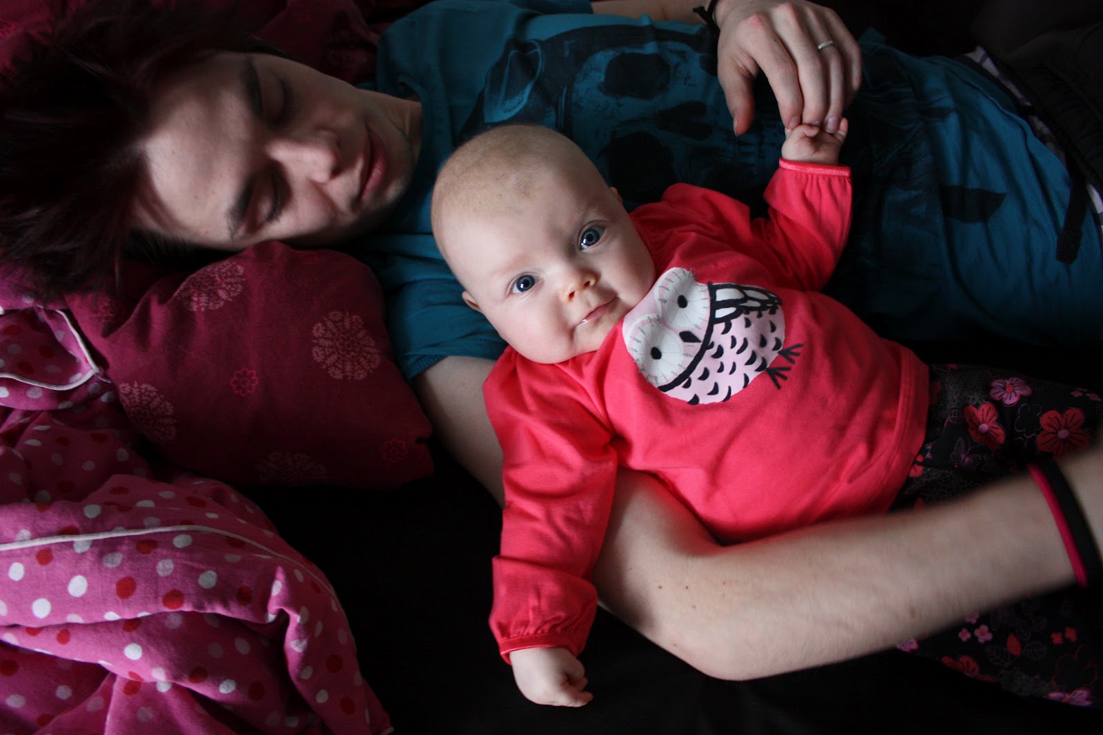 ”BLÖÖÖ ei jaksa nousta! Täs isin kainalos on liian mukavaa!”