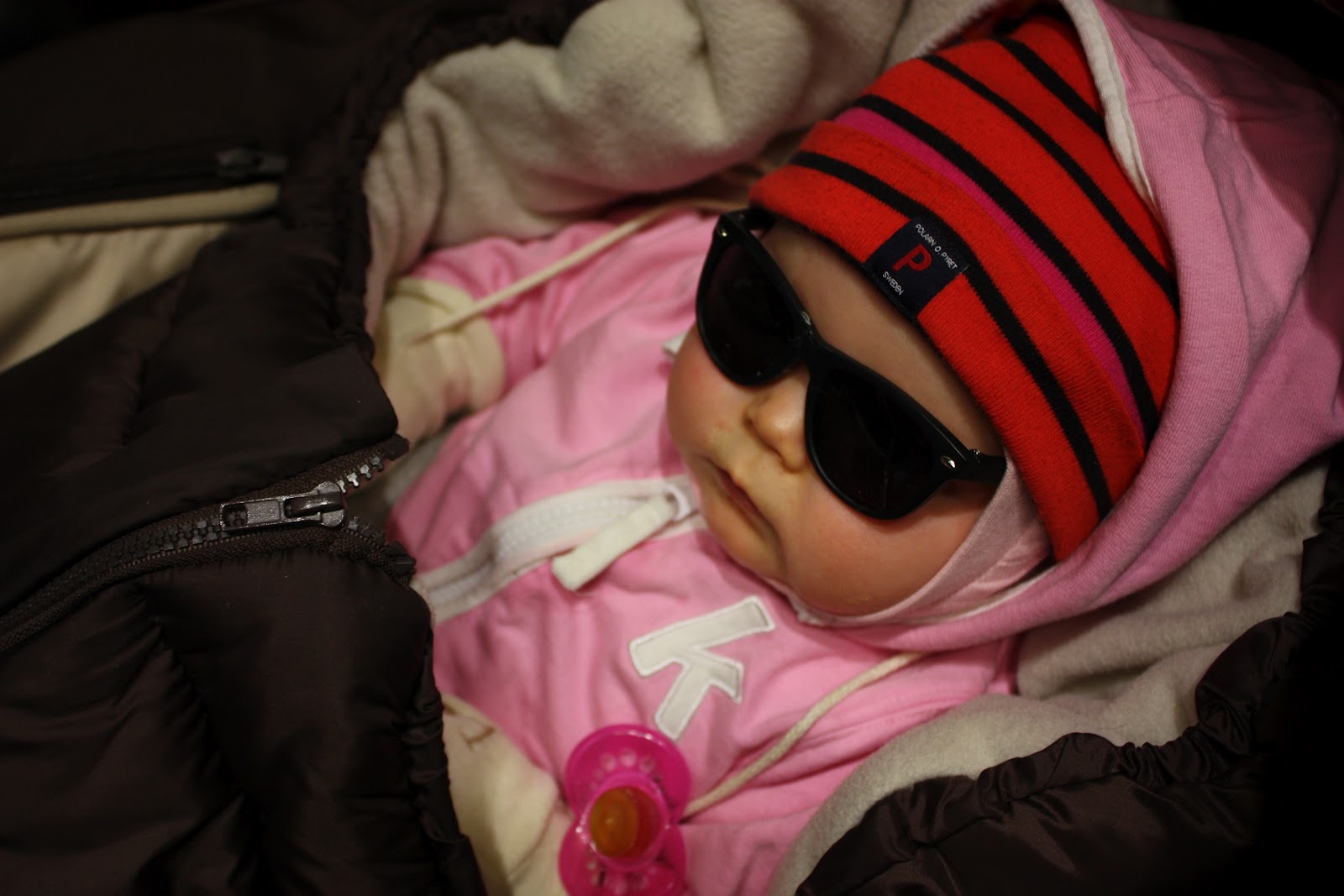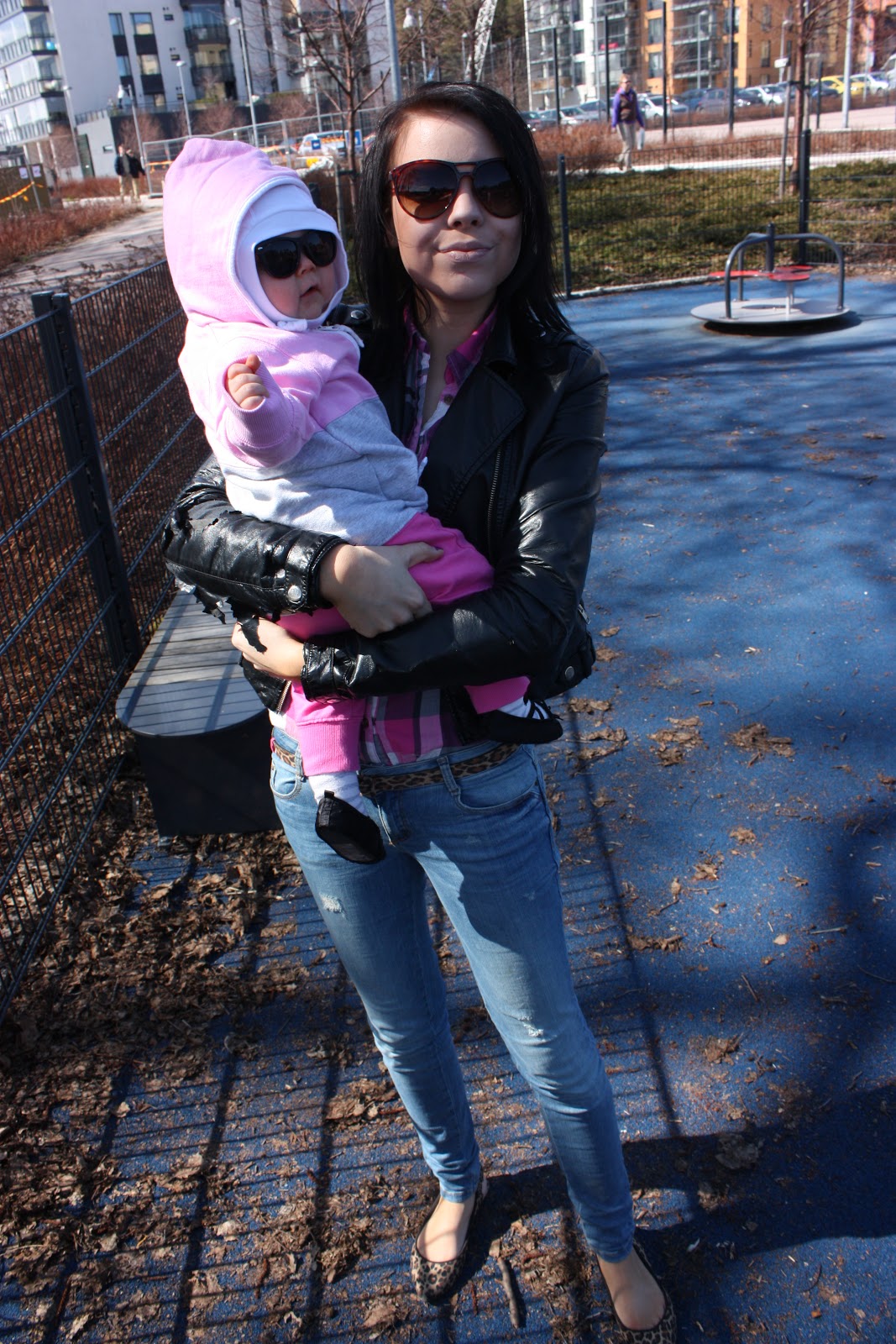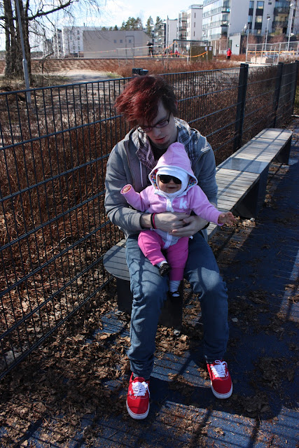 Eilen tännekin tuli vihdoin upee kevätkeli ja ei edes pahemmin tuullut niin oli kyllä mukava käydä lenkillä. Kierrettiinkin vissiin meidän pisin lenkki ikinä Saran kanssa ja aikaakin vierähti reilut kaksi tuntia. Tiara ihmetteli hereillä vaunuissa koko lenkin ajan ja mm. söi lapasiaan ja haalarinsa vetoketjua. Onneksi oli niin lämmintä ettei haitannut että lapasetkin kastui kuolasta. Ja vaikka Tiaralla ei ollut päällä kuin sisävaatteet+collegehaalari niin neiti oli aivan hikinen, musta tuntuu että ehkä pitäis alkaa vähentämään ton lämpöpussin käyttöä pikkuhiljaa kun sieltä tuntuu aina kurkistelevan hikinen Tirriskä. Nää kevätilmat on jotenkin vaan niin hankalat ton lapsen pukemisen kannalta, mutta noh, ehkä kohta tulis pysyvästi lämmintä niin ei ois nii hankala miettiä joka aamu että mitä sitä pukee päälle. Mutta tässäpäs vähän meidän ulkoilukuvia, osa by Sara ja osa mun omia räpsimyksiä.