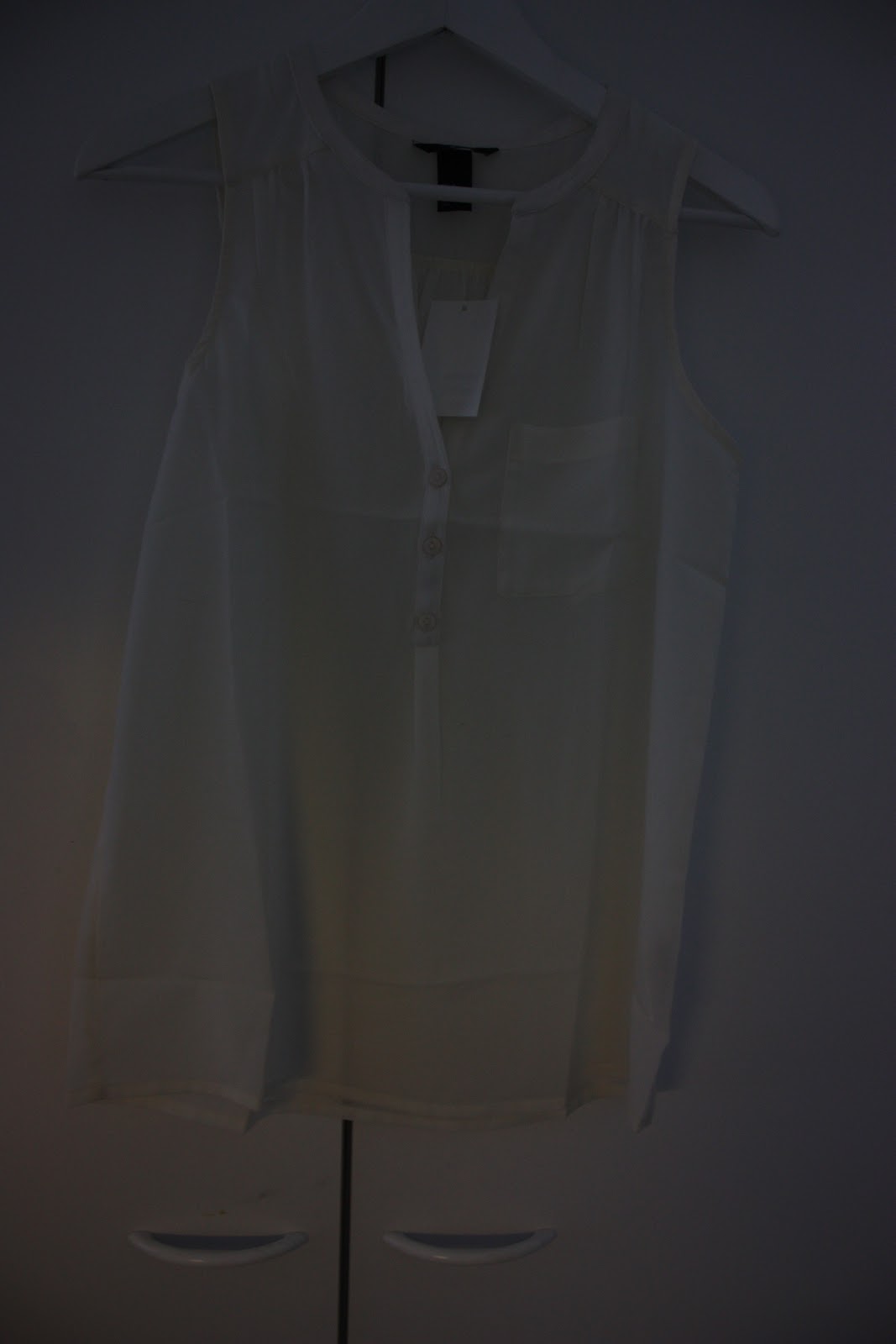 Valkoinen ohutta kangasta oleva läpikuultava löllötoppi H&M:ltä. Toi kuva on ehkä maailman surkein, kai siitä jonkun käsityksen saa. Mut päällä toi on aivan ihanan näkönen! Tosta tulee mun kesän luottovaate.