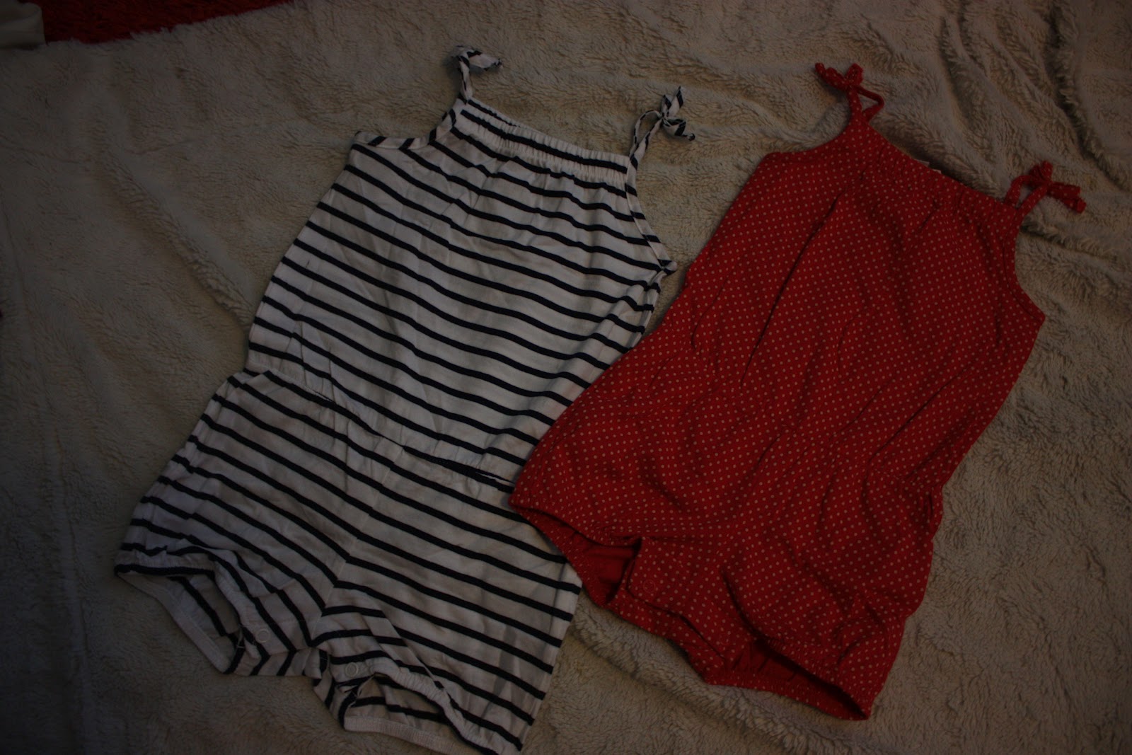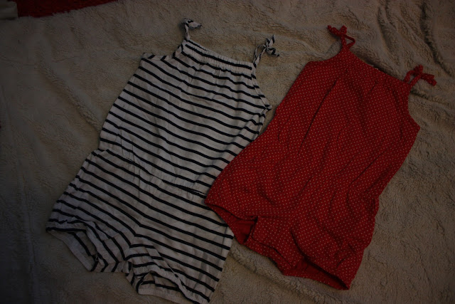 Ne ihanat shortsihaalarit joita hehkutin jo aiemmin! Toi raidallinen on kokoa 80 ja pilkullinen on 74 että on alkukesäksi ja loppukesäksi sopiva haalari. Ostospaikkana siis H&M.