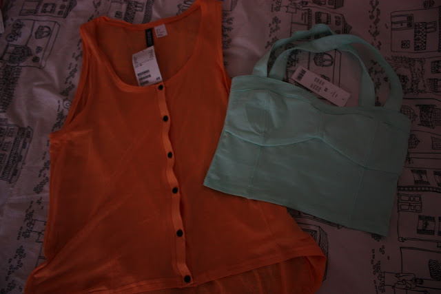 Ihanan oranssi löllötoppi on H&M:ltä, ihastuin tohon väriin! Toi on täydellinen kesällä vaikka farkkushortsien ja täydellisen rusketuksen kanssa. Ja sit toi mintunvihreä lyhyt toppi, toi on aivan ihana. Oon miljoona kertaa kattonu tota ennen kun nyt päätin ostaa koska oon aina miettiny että minkä kanssa mä oikeen voin käyttää tota, mut sit tajusin et toi on ihan täydellinen vaikka korkeavyötäröisen hameen tai -shortsien kanssa kesällä ja toi väri on kyl niin rakkaus.