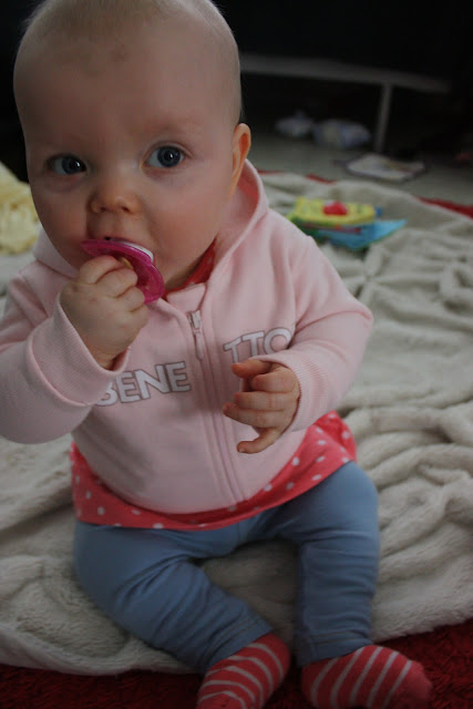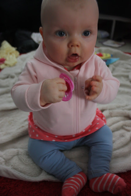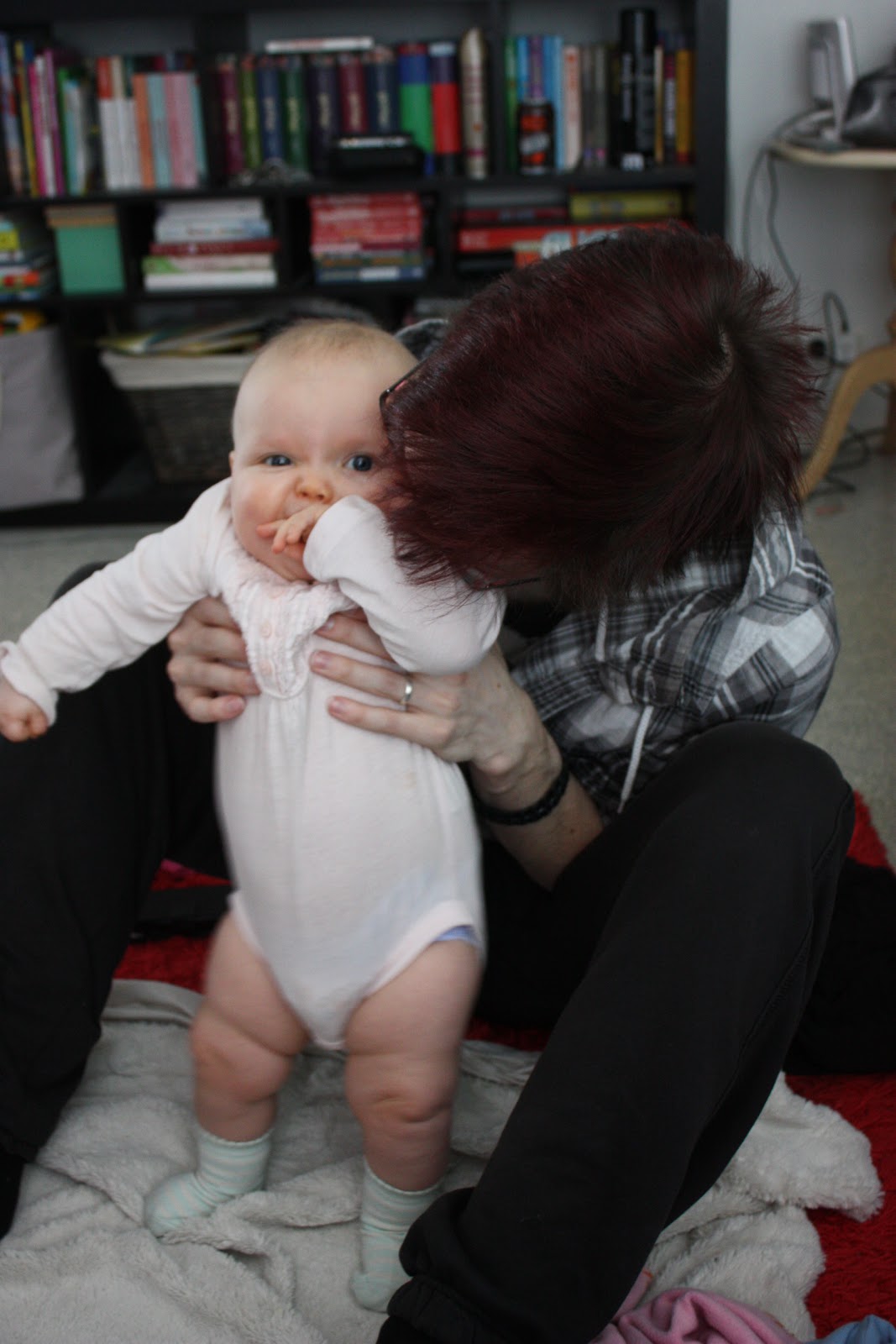 Sitä aina joka kuukausi herää tajuamaan sen että kuinka paljon kuukauden aikana voikaan tapahtua kehitystä, niin lapsessa kuin vanhemmissakin. Joka kuukausi kun ikää tulee lisää mä jaksan hämmästellä sitä miten paljon lapsi oppii uusia asioita 30 päivän aikana, miten isoja asioita! Jos aikuinen olis kykeneväinen oppimaan noin suuria juttuja niin lyhyessä ajassa niin mehän oltais kaikki ihan älyttömän fiksuja! Mutta kyllä mun mielestä meissä vanhemmissakin tapahtuu kehitystä aina kuukauden aikana, joka kuukausi (no okei joka päivä) mä huomaan rakastavani meidän neitiä vielä miljoona kertaa enemmän. Ja joka kuukausi mä opin tuntemaan sen paremmin, mistä se tykkää, mistä ei tykkää, mikä saa nauramaan ja mikä ehkä päristelemään. Millä saa pienen itkun loppumaan ja mikä saa ihanan suloisen hymyn Tiaran kasvoille. Okei no Tiara hymyilee melkeinpä aina, nauru on vähän vaikeempi; siihen tarvitaan joko pomputtelua tai masun nuuskutusta, kutituskin joskus toimii.