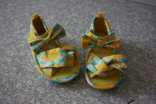 Keltaiset ihanat sitruunasandaalit Tiaralle,  H&M. Miten noista vois olla tykkäämättä?! Vaihtoehtona oli denim-lookaliket tai sitten valkoiset pienillä kuvioilla ja kyllä nuo keltaisen pirtsakat vei mun sydämen ihan totaalisesti!