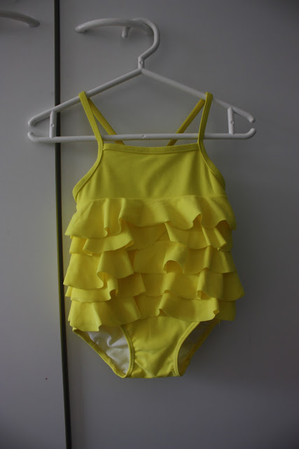 Keltainen ihana räyhelöuikkari Tiaralle, H&M. Mä en halunnu Tiaralle mitään stereotyyppistä muumi-bamse-hellokitty raitaruutu -viritelmää uimapuvuksi mutta suurimmaksi osaksi niitä on kaupoista löytynyt. Sen takia hypinkin innosta kun vihdoin löysin yksinkertaisen tyylikkään mutta silti ihanan iloisen uikkarin tuolle pirtsakalle neidille, ja täähän mätsää ihan täydellisesti niihin sitruunaisiin sandaaleihinkin!