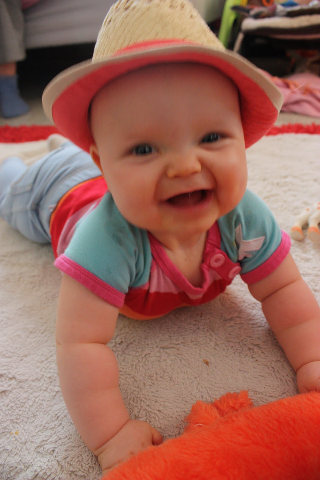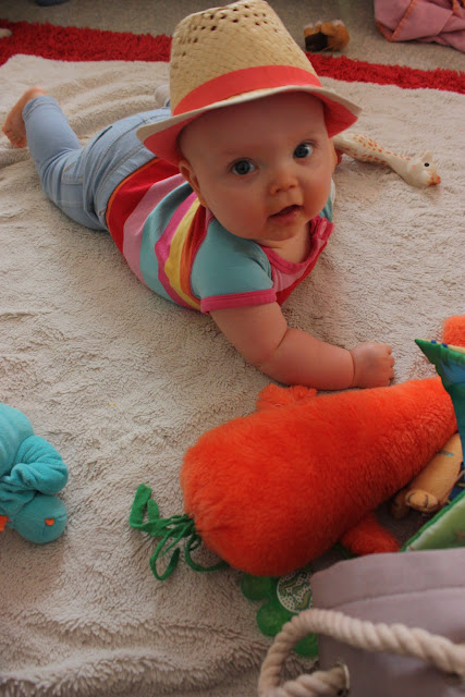 Ja sit mulla olis vielä kaikkein suurin asia kerrottavana, liittyen Tiaraan nimittäin! ARVATKAA kuka on oppinut ryömimään! Meidän ihana minivipeltäjä tietysti! Tiara vilistää nykyään ympäri kämppää sellasta vauhtia että oksat pois ja siinä saa kyllä kaikki nettipiuhoista naulakkoon ja Mörkö -koiraan kyytiä. Mörkö on onneksi kiltti Tiaralle eikä pienistä hermostu mutta toi meidän pikkutermiitti ei ole yhtä kiltti Mörkölle, on nimittäin muutaman kerran jäänyt jo sievoinen karvatuppo neidillä nyrkkiin kun on ehtinyt estelyistä huolimatta napata kiinni. Mutta mä jatkan sinnikkäästi ei -sanan käyttöä (siitäkin huolimatta että se aiheuttaa joka kerta neidissä riehakkaan naurukohtauksen). Miten mä voinkin olla näin epävakuuttava auktoriteetti Tiaran mielestä, eiks äitiä pitäis totella ;D! Tässä vielä pari kuvaa ihanasta Tirriäisestä: