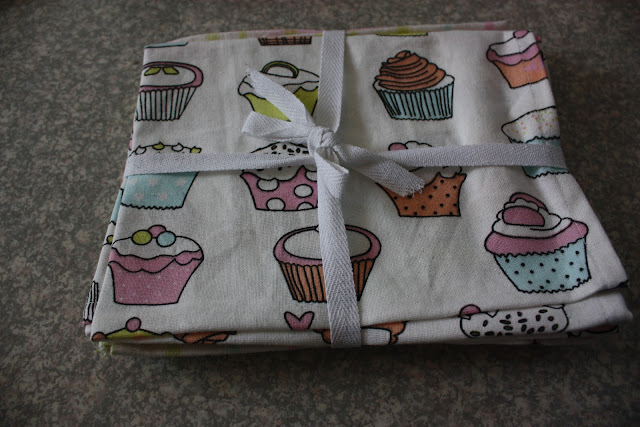 Mun mielestä noi astiapyyhkeet on aivan supersuloiset, tossa setissä oli kaksi joista toinen on juurikin tuo kuvassa näkyvä cupcake -ihanuus ja toinen on ihanan värikäs ja ruudullinen. Tulee niin kesäfiilis!