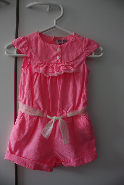 Neonpinkki shortsihaalari Tiaralle Zarasta. Toi on sulosin vauvanvaate mitä mä oon koskaan nähnyt! Ainoa vaan että Zarassa noi vaatteet on ihan hullun pienikokosia, siis toi haalari on kokoa 12-18months mutta oikeesti toi on saman kokoinen kun Tiaran 74-koon vaatteet. Hinta oli ehkä vähän suolainen yhden kesän ohuesta lärpäkkeestä mutta kyllä toi oli sen arvoinen aarre, ai että!