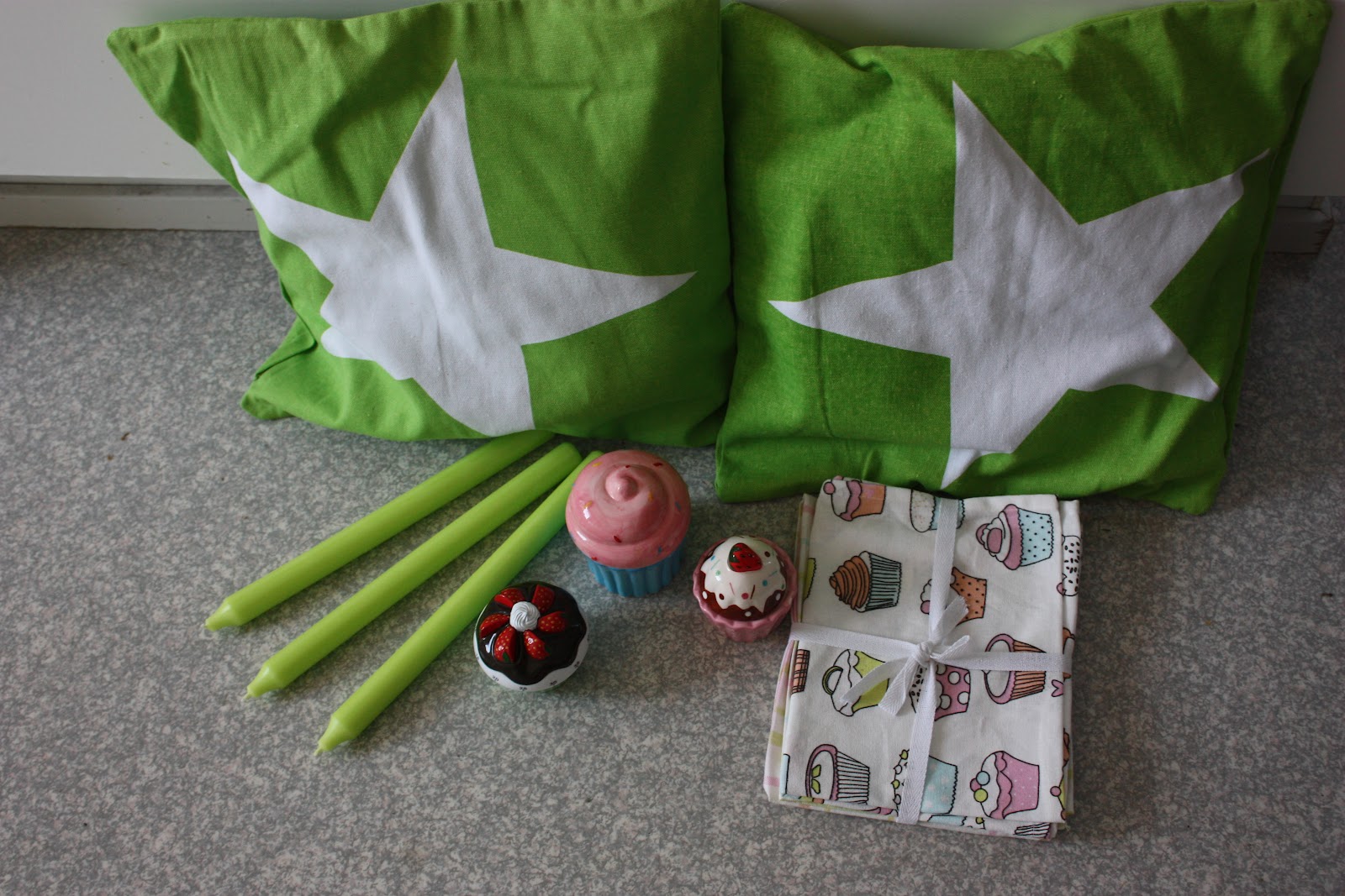 Vihreät tähtityynyliinat, astiapyyhkeet ja vaaleanpuna-sininen cupcake -purkki