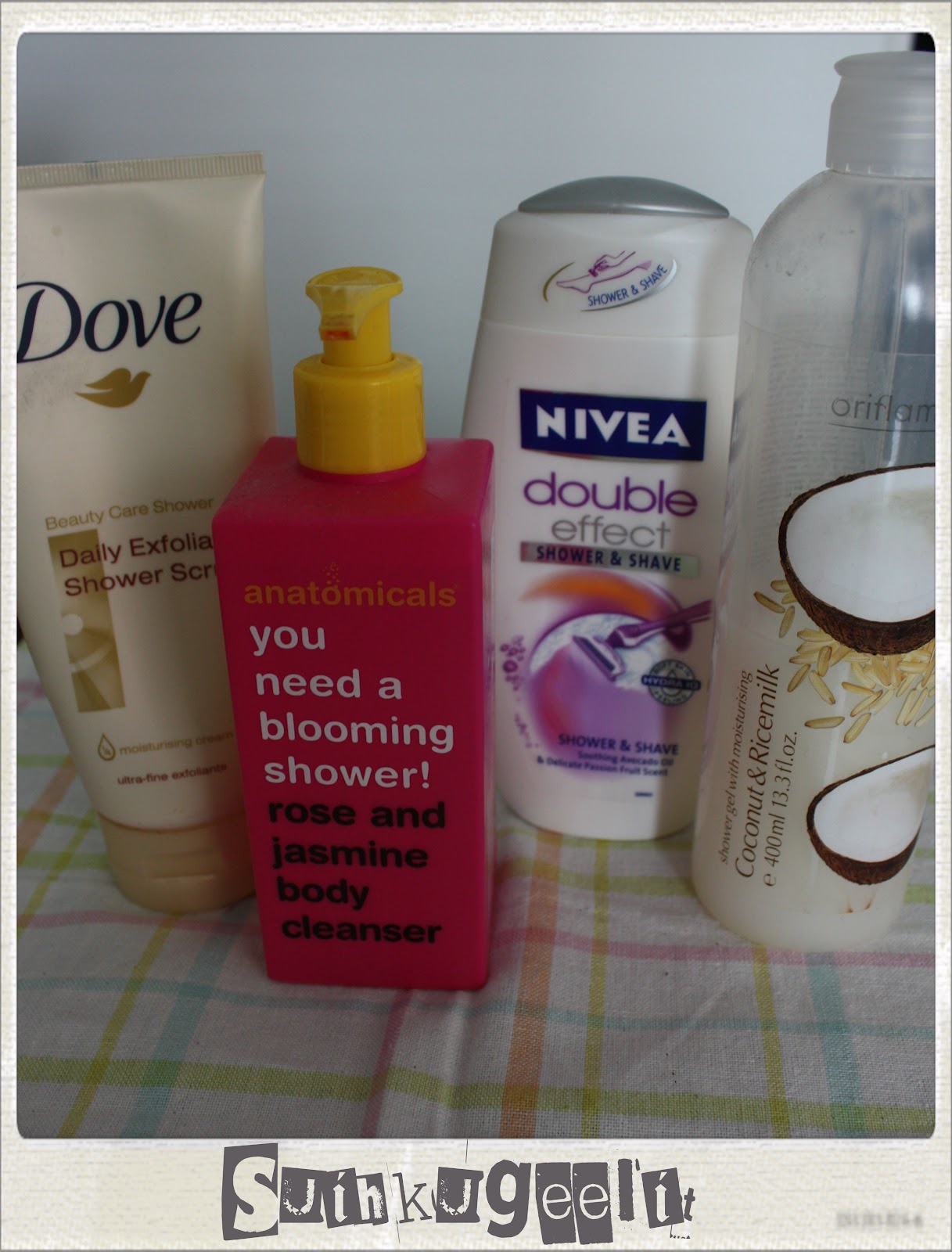 Suihkugeelit -kategoriaan laitoin myös tuon Doven vartalonkuorinta-aineen joka on ihan parasta ja tuoksuu niin namille! Sit mulla on anatomicalsin tommosta jossa on ihanan pirteä purkki, Oriflamen kookos-suihkugeeliä (johon olin aivan koukussa raskausaikana, mut enää ei oikein uppoa) ja sitten Nivean shower&shavea koska olen laiska enkä jaksa erikseen käyttää mitään sheivausgeelejä.