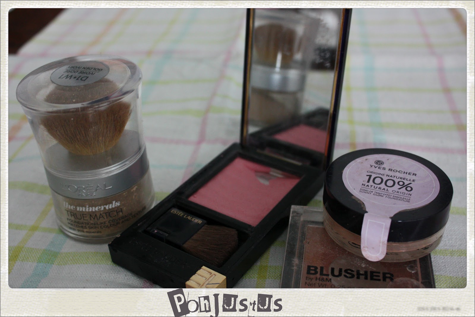 Meikki”voiteena” mulla on Lorealin True Match Minerals -mineraalimeikkipuuteri ja mä en luopuisi siitä mistään hinnasta! Mä en jotenkin tykkää voidemaisista meikkivoiteista ja toi on mun mielestä ihanan kevyttä kun sitä ei tarvitse laittaa kilokaupalla. Sitten tossa on Estee Lauderin poskipuna ja Yves Rocherin aurinkopuuteri joita käytän suunnilleen joka päivä. Toi H&M:n blusher eli vähän tummempi aurinkopuuteri on mulla käytössä silloin kun rusketuksessa löytyy (eli tälläkin hetkellä).