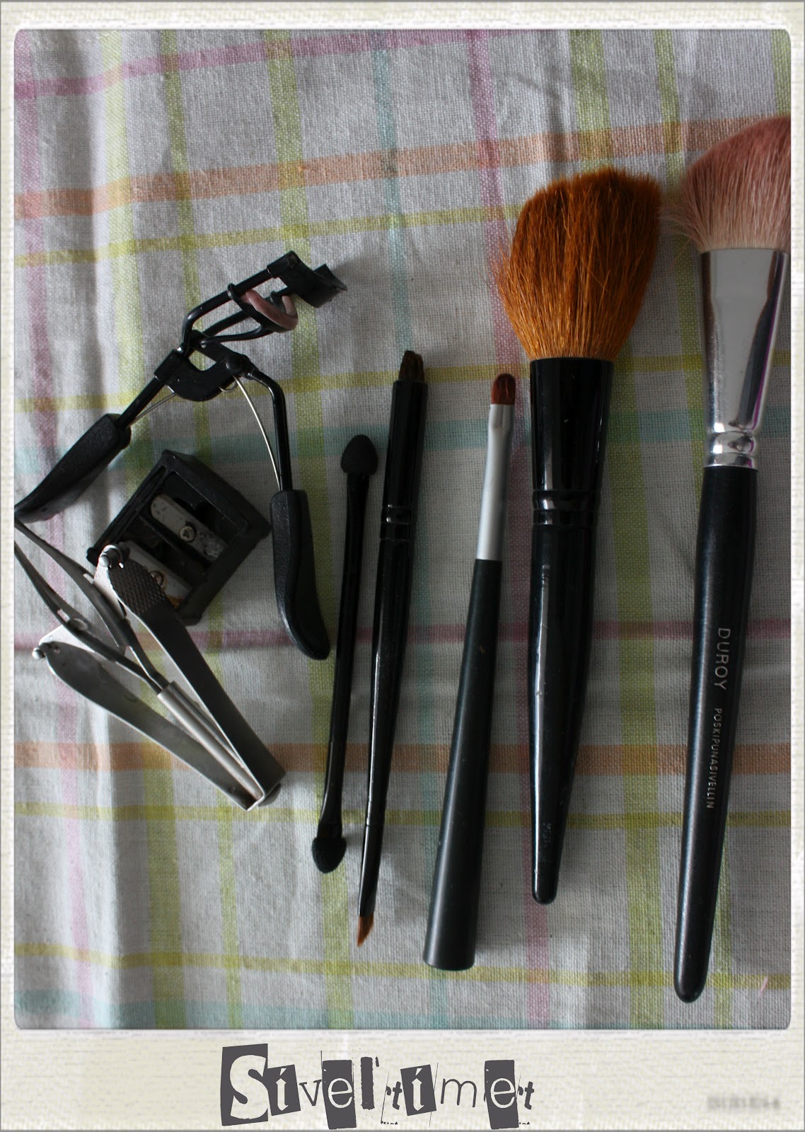 Tässä kuvassa on ne siveltimet ja muut meikkivälineet joita käytän lähestulkoon joka päivä kun teen normaalin arkimeikin. Sitten lätkäisin vielä tuohon teroittimen ja automaattipinsetit mutta niitä en niin kovin usein tarvitse. Ripsentaivutin, luomiväriapplikaattori, häivytyssivellin, huulipunasivellin, aurinkopuuterisuti ja poskipunasuti.