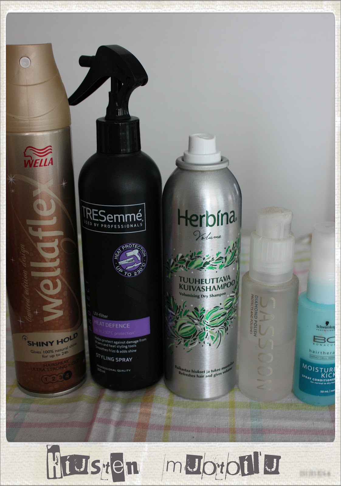 Mulla on yleensä Tresemmen lakkaa, mutta nyt se oli just loppunut ja Otto oli heittänyt pullonkin roskiin joten otin mun Wellan varalakan sitten tähän, on toikin ihan okei mut mieluummin käytän kyllä ees vähän laadukkaampaa tavaraa. Tresemmen lämpösuoja on ihan parasta ja sekin jo suosikki monen vuoden takaa! Mä oon kokeillut aika monia kuivashampoita ja mun mielestä ne kaikki toimii suht samalla tavalla, tuoksu on tyyliin ainoa eroavaisuus eri merkkien välillä. Mun mielestä toi Herbinan kuivashampoo on hyvä, vaikka oikeastaan käytän sitä vain silloin kun teen kunnon tupeerauskampauksen.