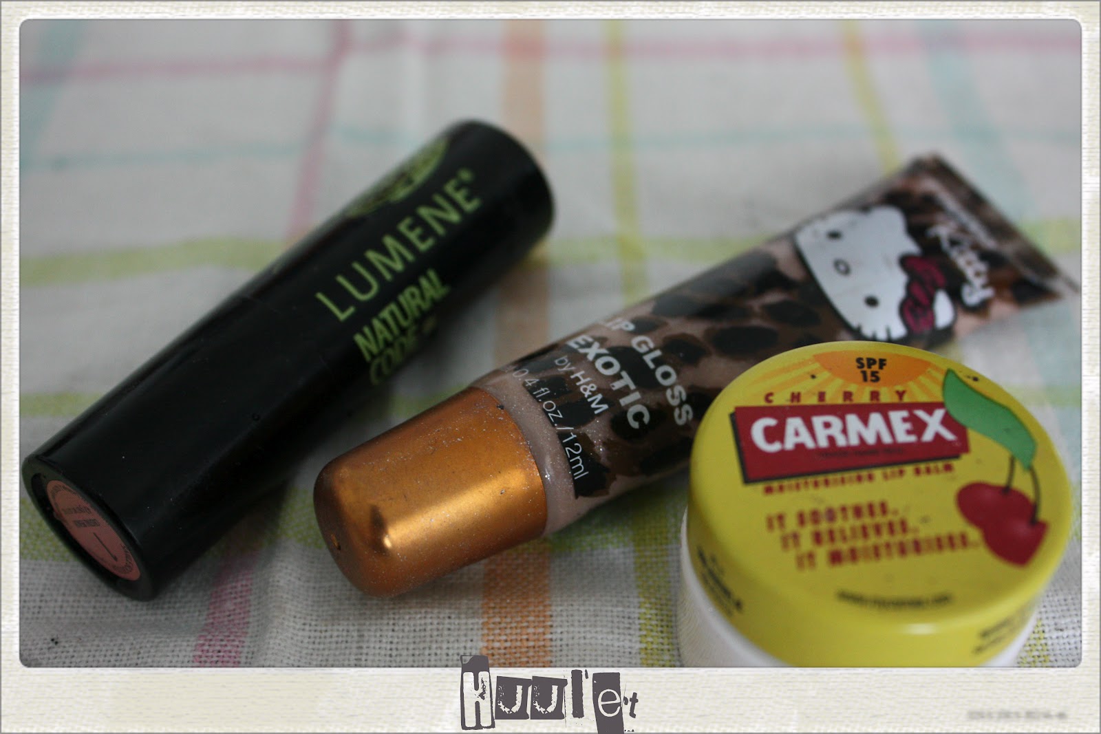 Huulia mä en pahemmin yleensä meikkaa, mutta käytän jokapäivä monta kertaa tota Carmexin kirsikkahuulirasvaa. Se on niin parasta! Jos mä kuitenkin satun innostumaan niin sitten mulla on arkimeikkiä varten Lumene Natural coden nudehuulipuna tai H&M:n nudenvärinen huulikiilto. Multa löytyy myös pinkki ja punainen huulipuna kuten ootte joistain vanhoista postauksista ehkä huomanneet mut ne ei kyllä tosiaankaan kuulu mun arkimeikkiin niin siksi en niitä nyt liittänyt tähän ettei mene sekavaksi.