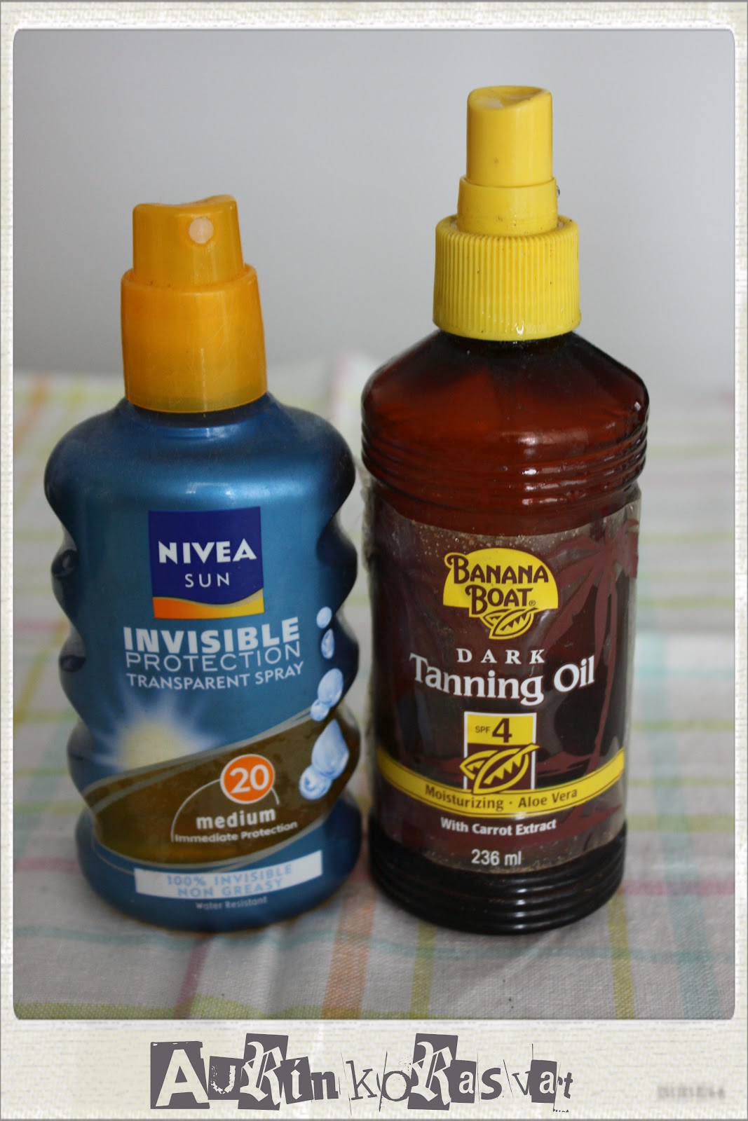 Toi Nivean aurinkorasva on ihanan kevyttä, hyväntuoksuista ja kuivaa nopeaa. Ja toi Banana boatin rusketusöljy on parasta mitä tästä maailmasta löytyy, harmi vaan etten ainakaan vielä ole sitä onnistunut Suomen markkinoilta bongaamaan, toivottavasti jo tänä vuonna!