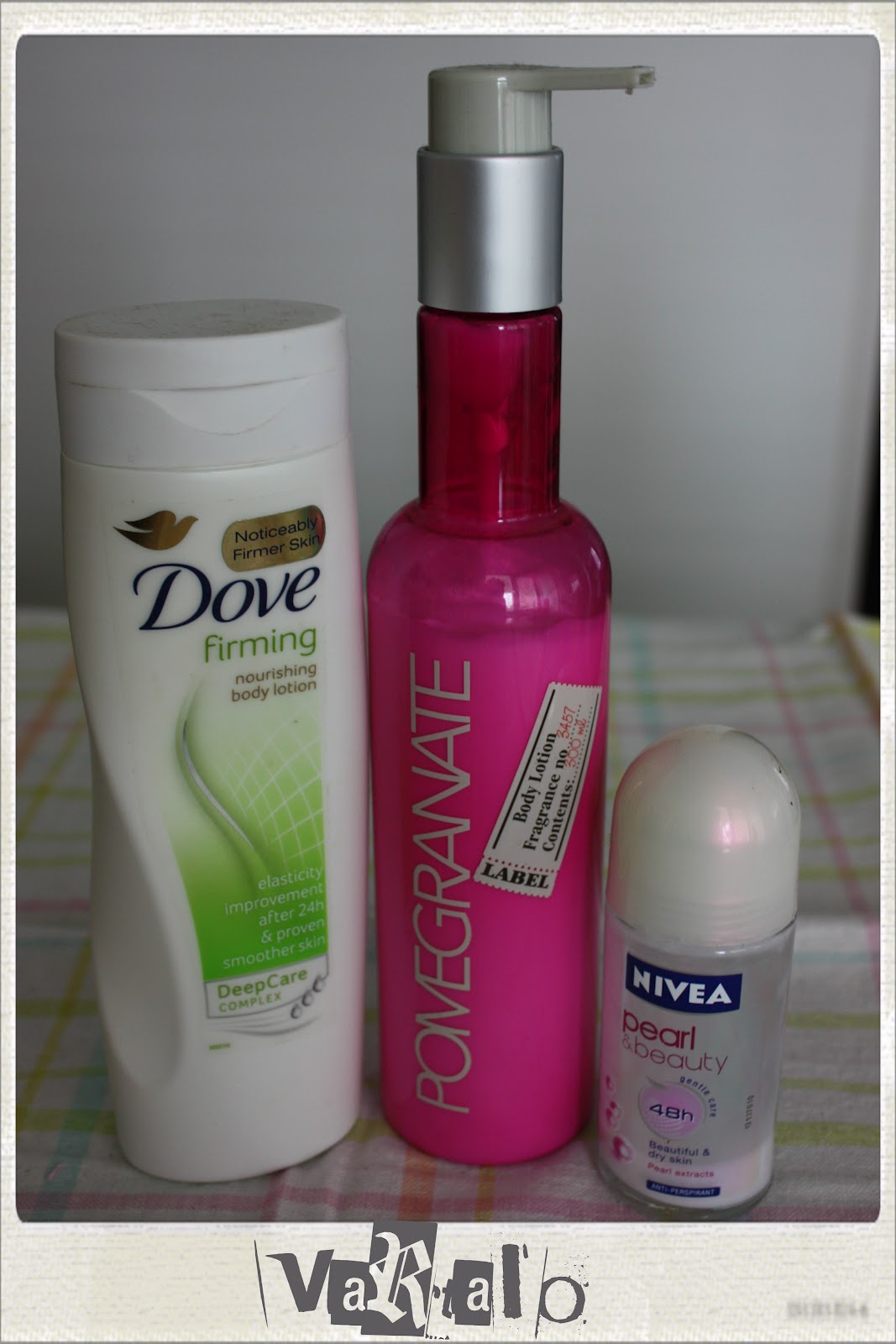 Mä oon todella surkea käyttämään kosteusvoiteita, mutta silloin kun joskus muistan niin käytän tota Doven firming nourishing body lotionia yleensä. Toi Pomegranate -kosteusvoide oli vaan pakko ostaa ylisuloisen purkin takia! Ja deodoranttina mulla on Nivean pearl&beauty, joka nähtävästi on ihan lopussa eli pitää ostaa lisää!