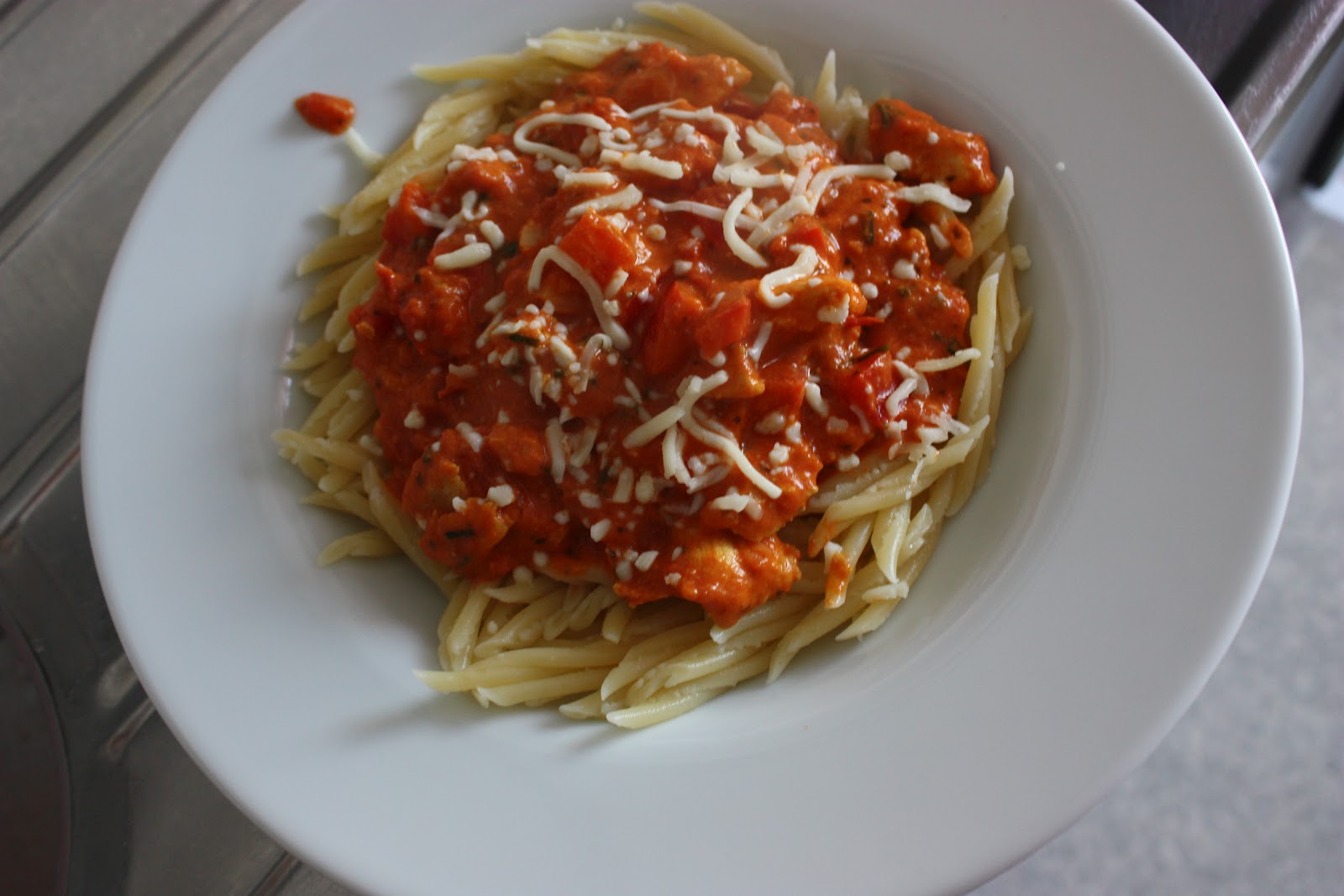 Laita broilerinfileesuikaleet pannulle paistumaan ja pilko sillä aikaa sipulit ja vihannekset. Lisää pilkotut vihannekset ja sipulit pannulle ja freesaa hetki, tämän jälkeen lisää tomaattimurska ja ruokakerma. Anna lämmetä pannulla vielä hetki ja lisää mausteita oman maun mukaan. Tarjoile keitetyn pastan ja juustoraasteen kanssa!