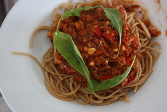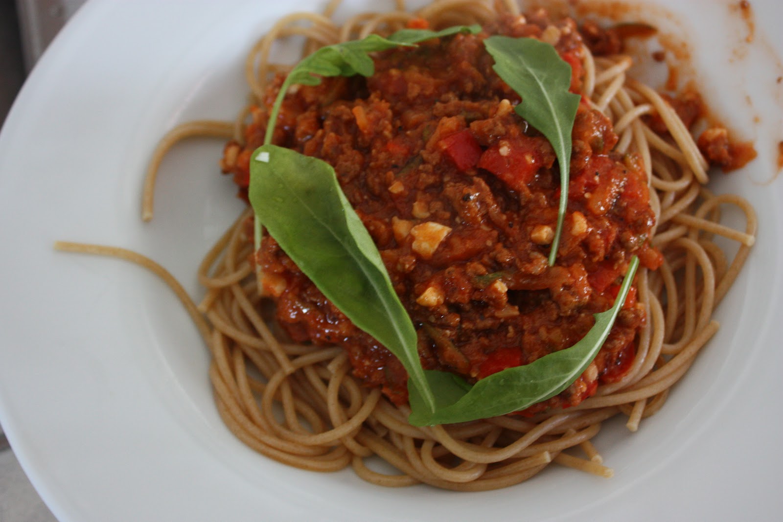 Laita jauheliha pannulle paistumaan. Pilko sillä aikaa vihannekset, chili ja sipulit. Lisää ne pannulle, anna paistua jonkin aikaa. Raasta Pecorino -juusto pieneksi ja murskaa pähkinät pieneksi muruksi. Lisää paseerattu tomaatti, juusto ja pähkinämuru pannulle ja kuumenna viitisen minuuttia. Lisää mausteet ja tarjoile keitetyn spagetin ja rucolan kanssa.