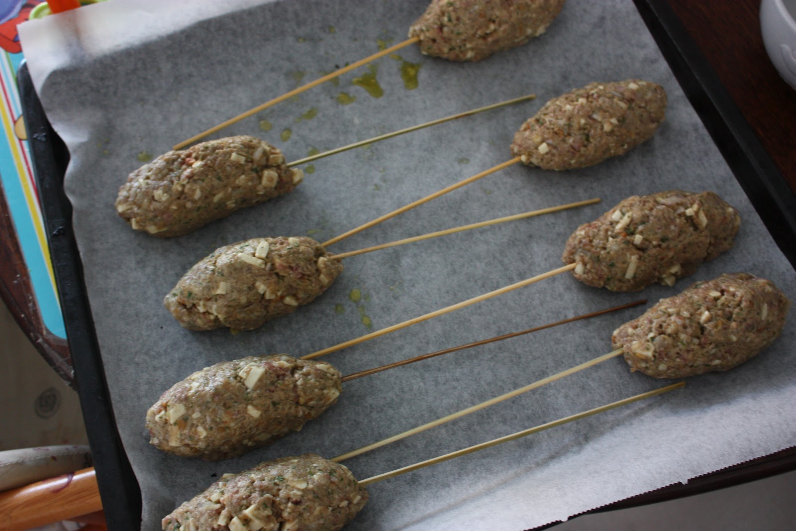 Pilko sipuli ja valkosipuli. Sekoita korppujauhot, sipulikeittoainekset ja kermaviili keskenään ja anna turvota hetki. Lisää joukkoon sipulit, valkosipulit ja jauheliha. Pilko sulatejuustoviipaleet pieneksi muruksi ja sekoita taikinan joukkoon. Lopuksi lisää kananmuna ja sekoita taikina tasaiseksi. Muotoile pötkylöiksi ja pujota vedessä liotetut varrastikut niiden sisään. Grillaa tai paista uunissa n. 20 minuuttia.